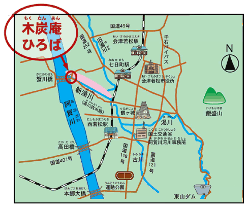 阿賀川と湯川の合流点付近にかかる蟹川橋の右岸側、大きな情報表示板が目印です。