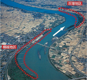 阿賀野川下流域は低平な地形であるため、堤防が決壊すれば洪水流が広範囲に広がり、新潟市をはじめ甚大な被害が想定されます。阿賀野川は蛇行が著しく、特に湾曲部の水の流れが強く当たる水衝部では、深掘れが生じやすく堤防が決壊する可能性が高くなります。このため、水衝部では深掘れを防ぐために護岸工や水制工などの補強工事を行なっています。