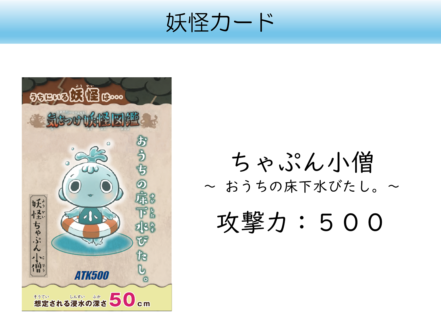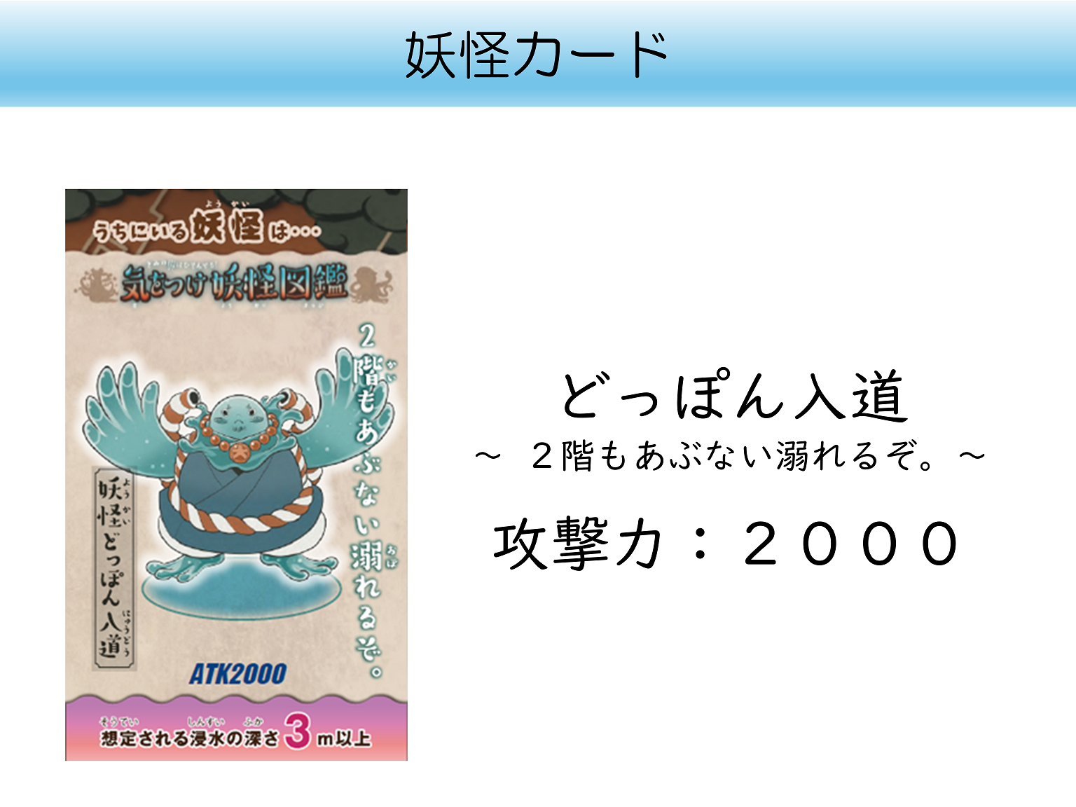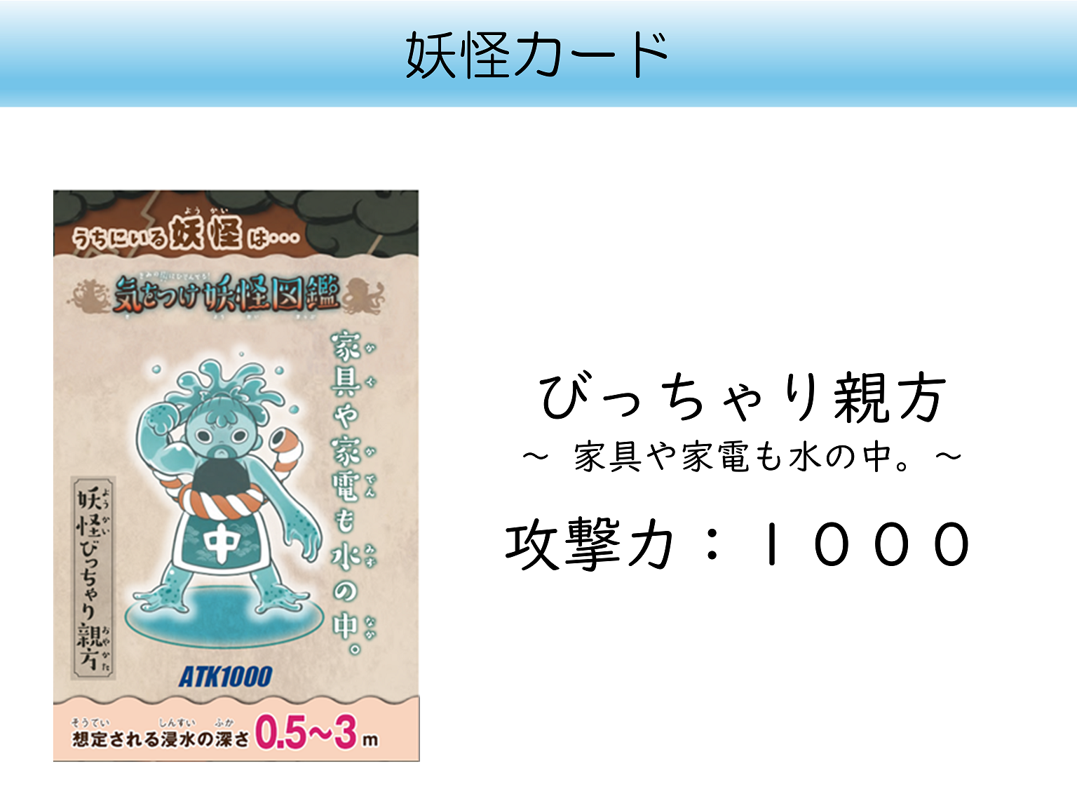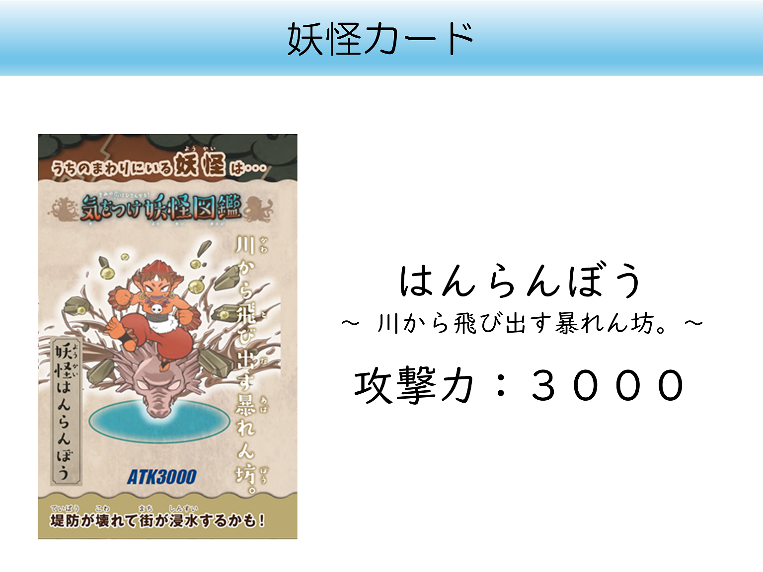水害リスクを分かりやすく伝えるために作られた防災教材キャラクター「気をつけ妖怪」を活用し妖怪と災害による攻撃、防災による防御の攻防を通じて、防災を学ぶ対戦型カードゲームを作りました。