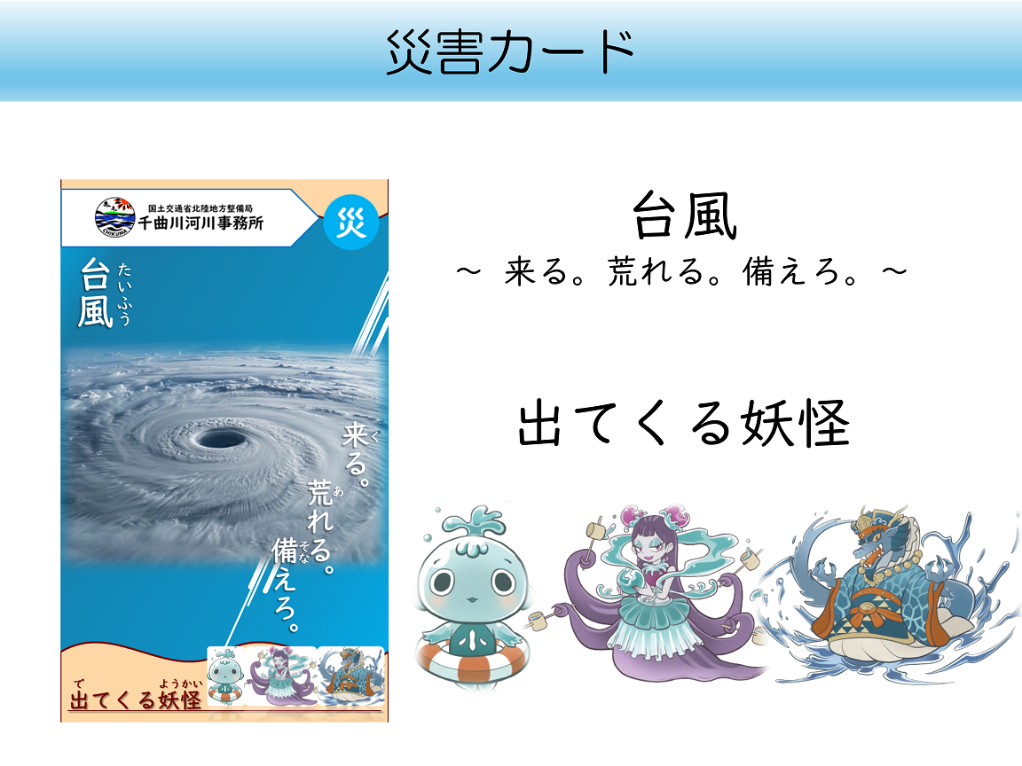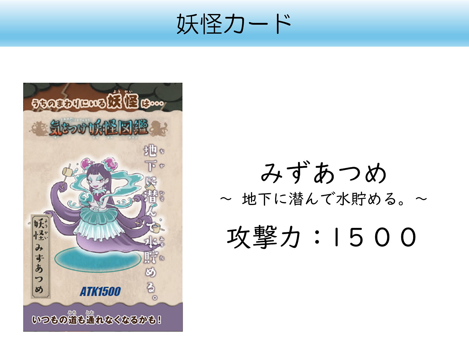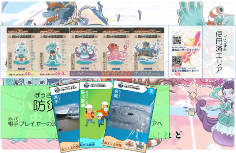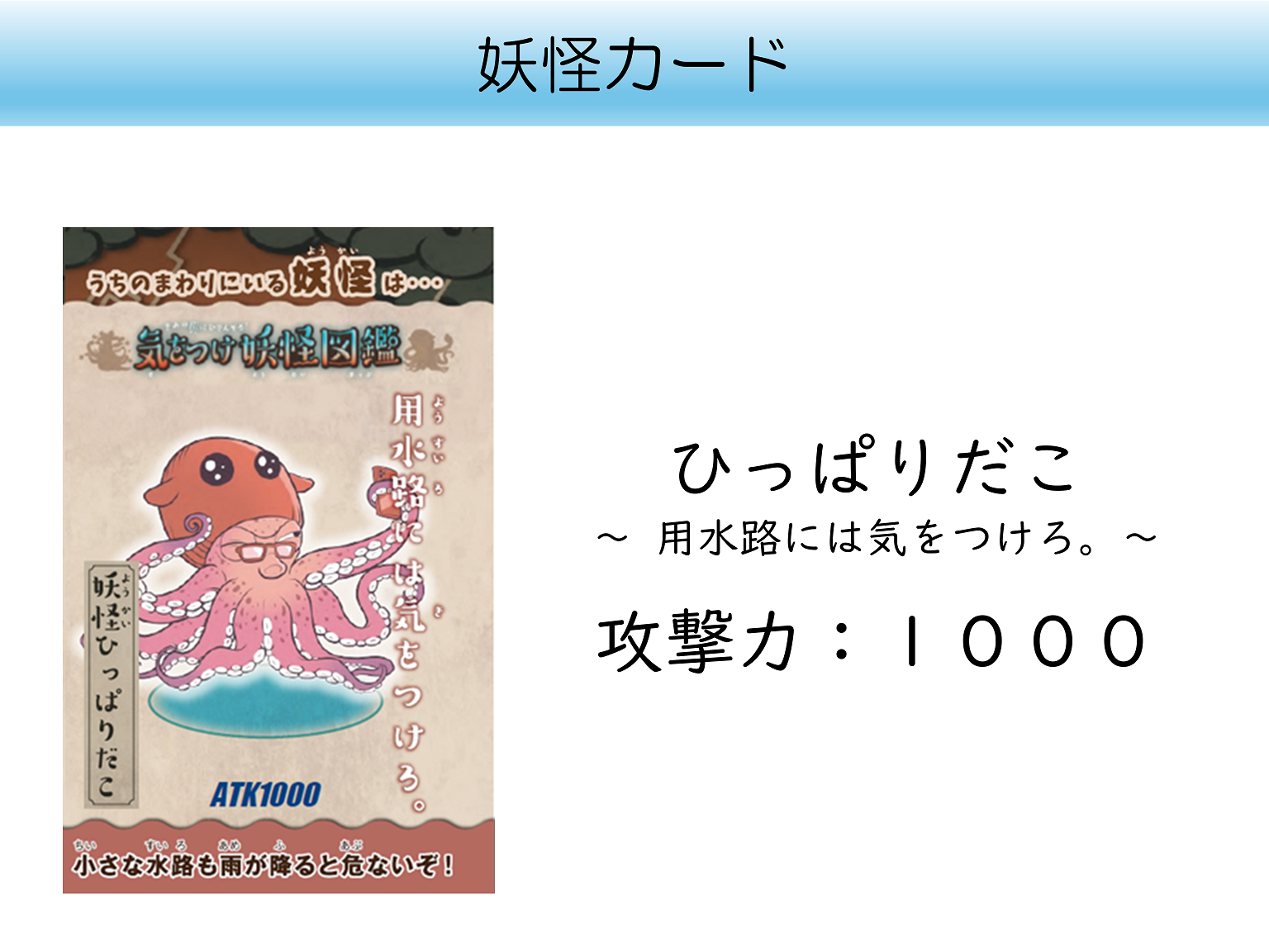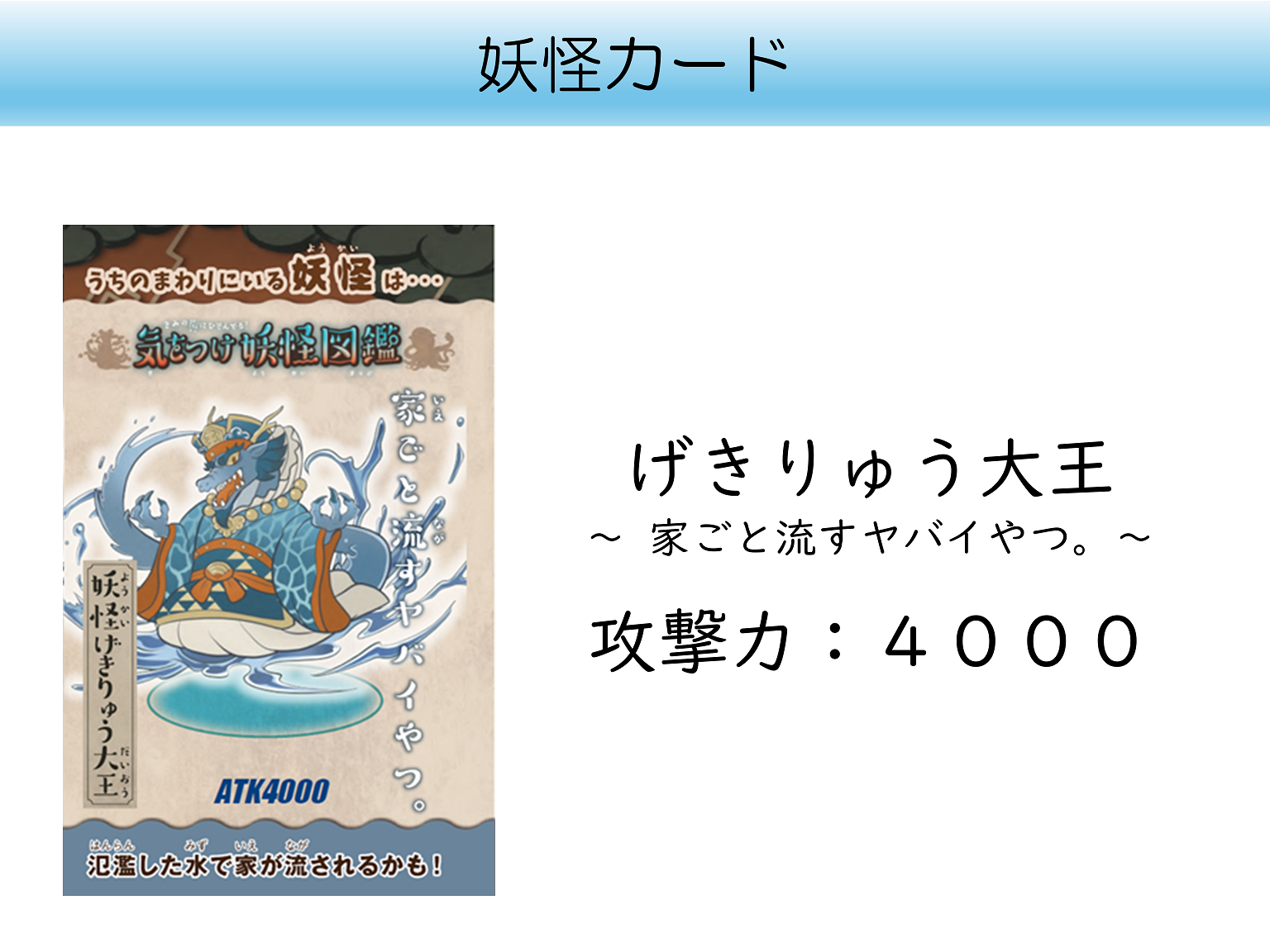 水害リスクを分かりやすく伝えるために作られた防災教材キャラクター「気をつけ妖怪」を活用し妖怪と災害による攻撃、防災による防御の攻防を通じて、防災を学ぶ対戦型カードゲームを作りました。