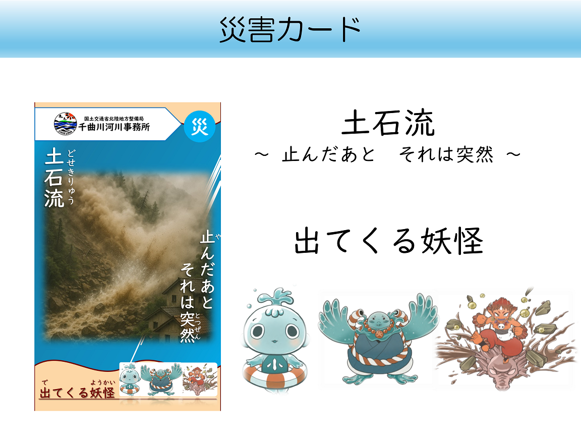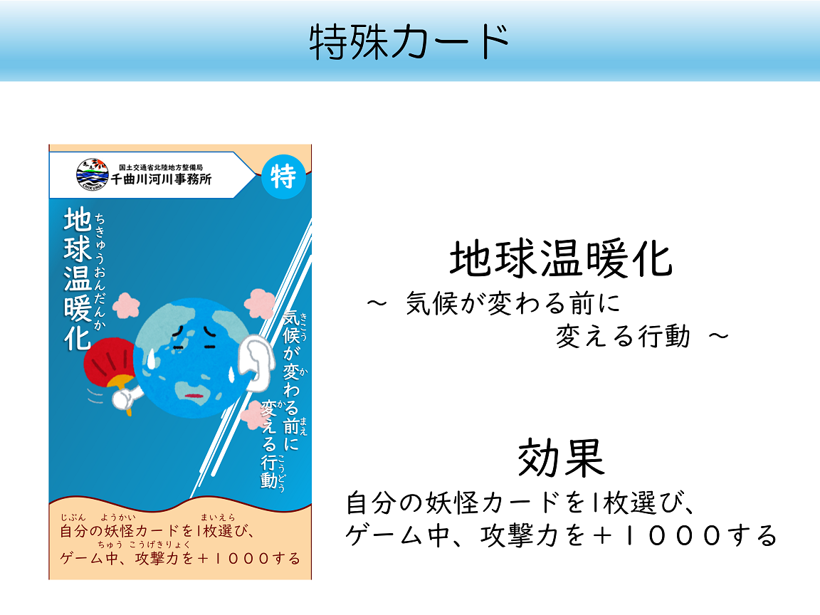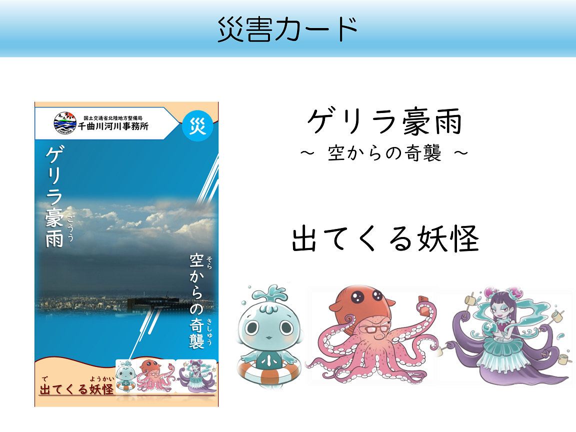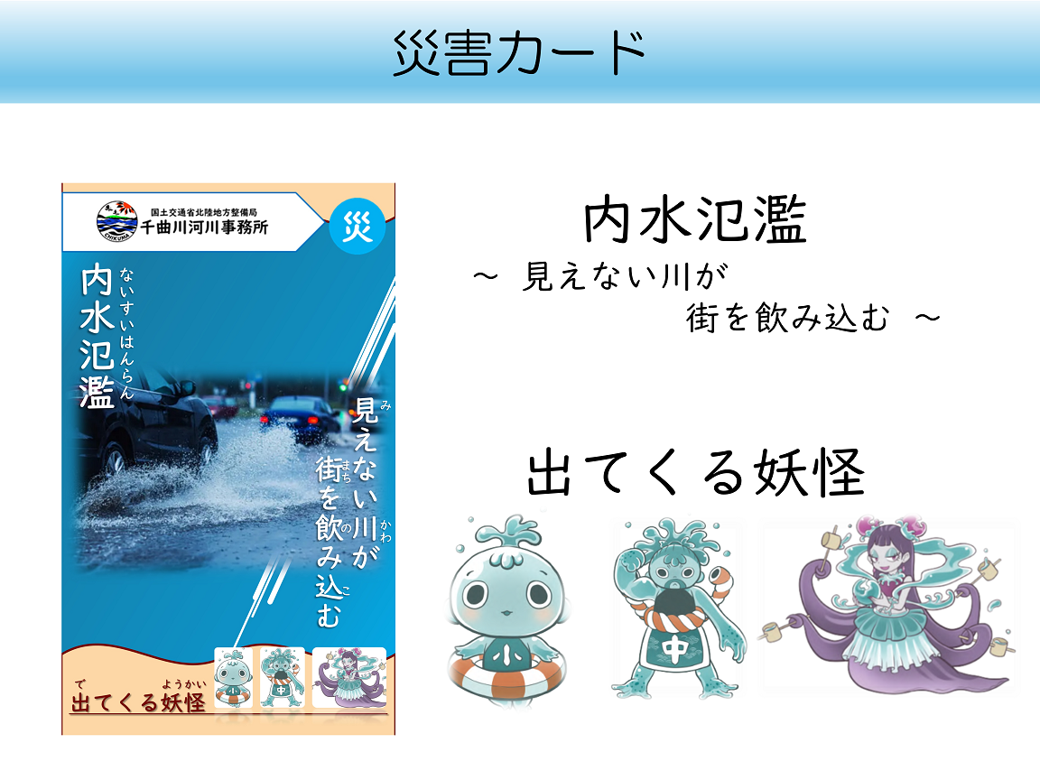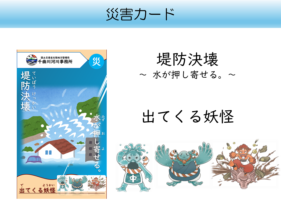 水害リスクを分かりやすく伝えるために作られた防災教材キャラクター「気をつけ妖怪」を活用し妖怪と災害による攻撃、防災による防御の攻防を通じて、防災を学ぶ対戦型カードゲームを作りました。