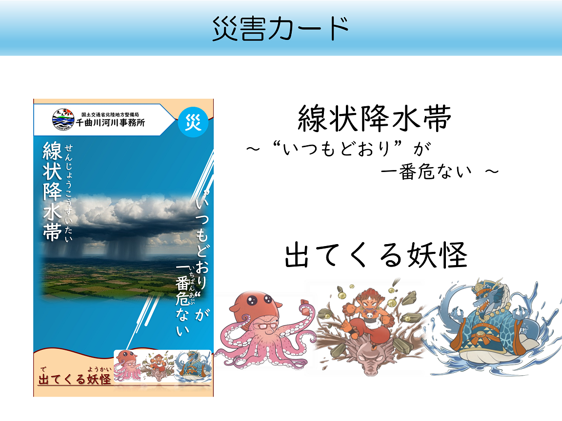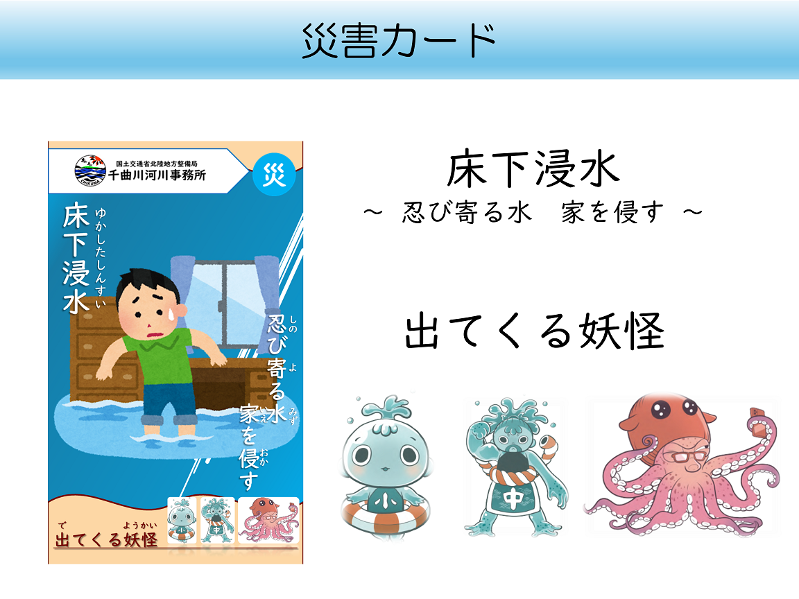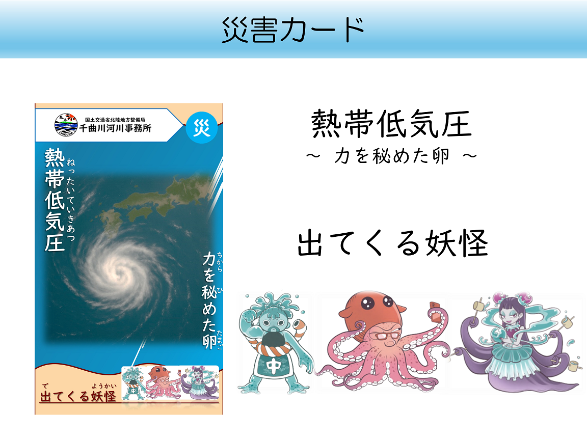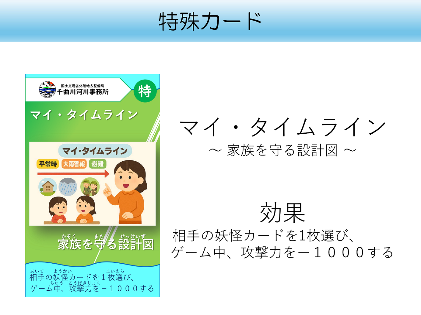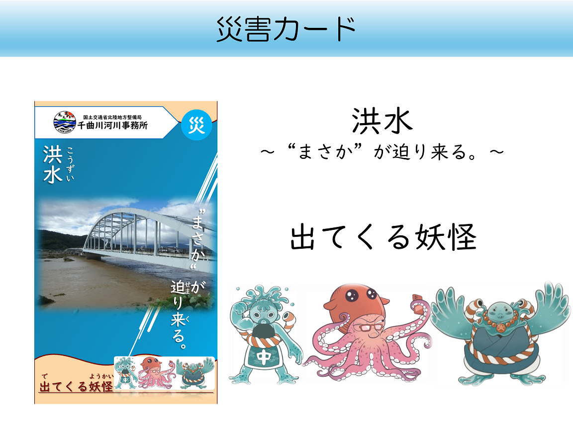 水害リスクを分かりやすく伝えるために作られた防災教材キャラクター「気をつけ妖怪」を活用し妖怪と災害による攻撃、防災による防御の攻防を通じて、防災を学ぶ対戦型カードゲームを作りました。