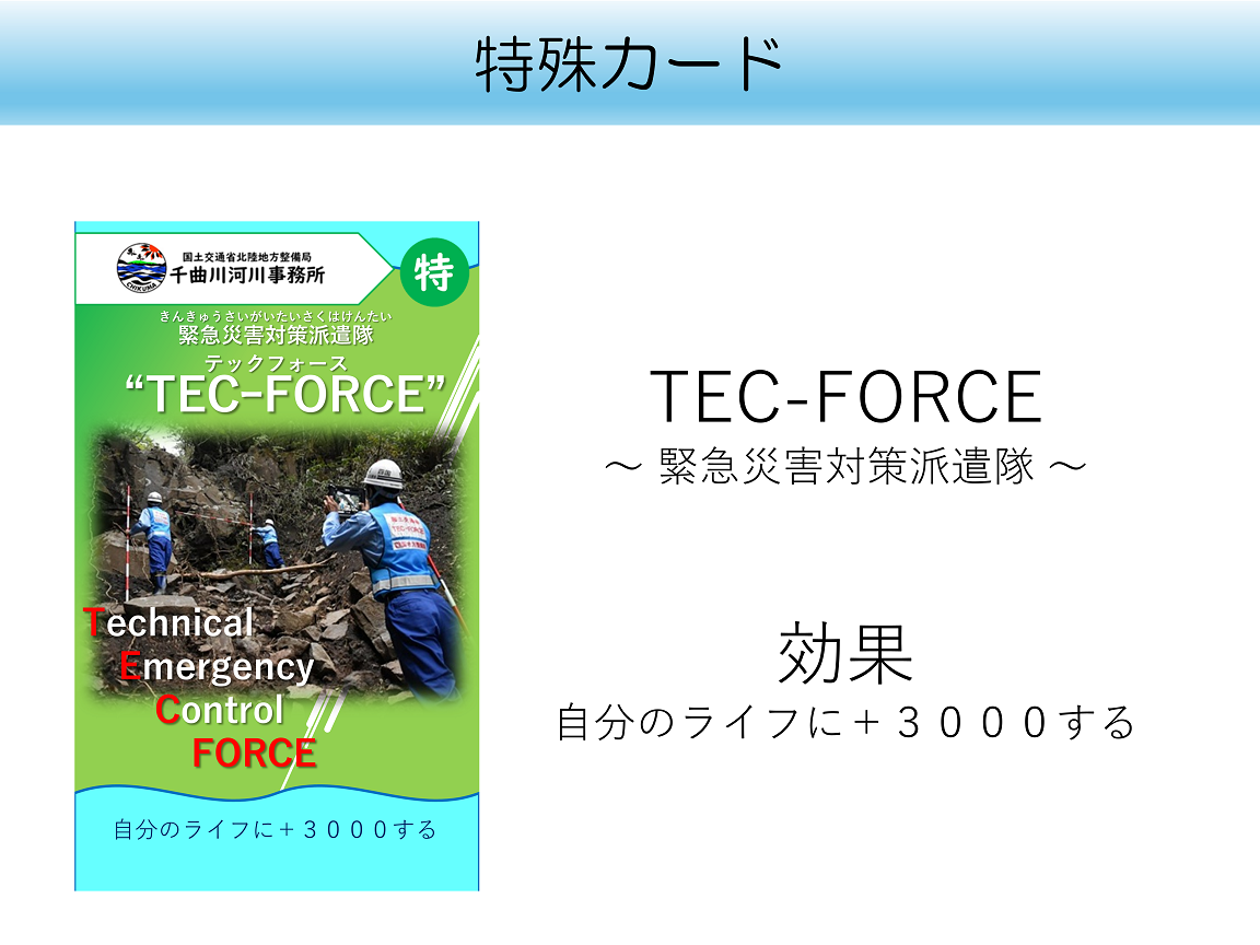 特殊カード:表向きで使用し、効果発動(例:テックフォース=ライフ+3000)。