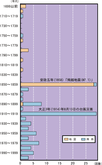 10年毎の災害発生箇所の件数をみますと江戸時代は飛越(角川)地震の記録を含めた地震による土砂災害の件数が多くなっています。明治以降は降雨災害の記録も多くなり、1910~1919年代の件数が多いのは大正3年の災害の影響です。それ以外でも10年程度の間に五~十数件の災害が発生しており、災害が多発する地域であることが分かります。