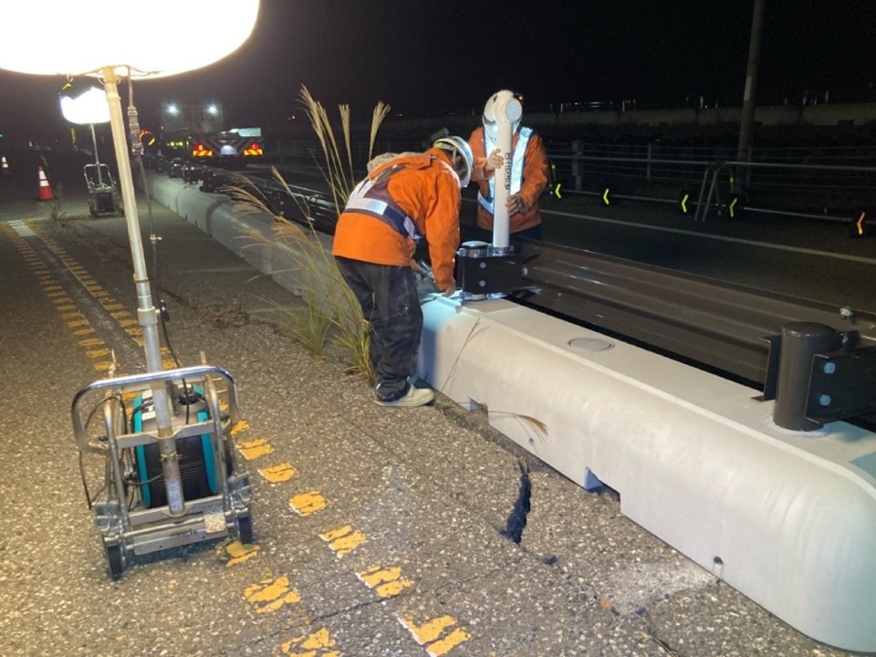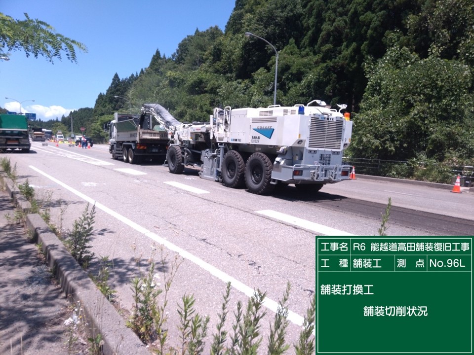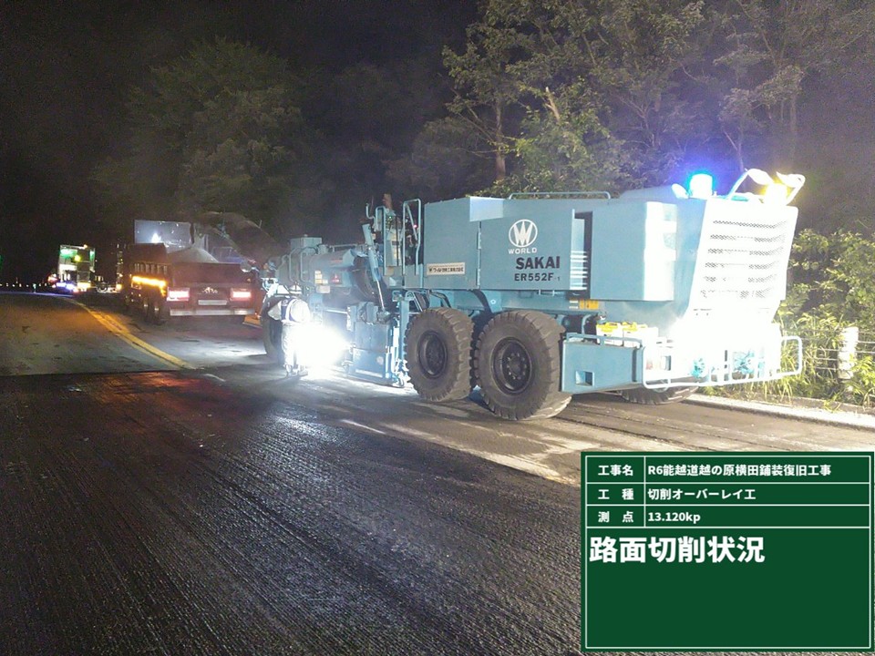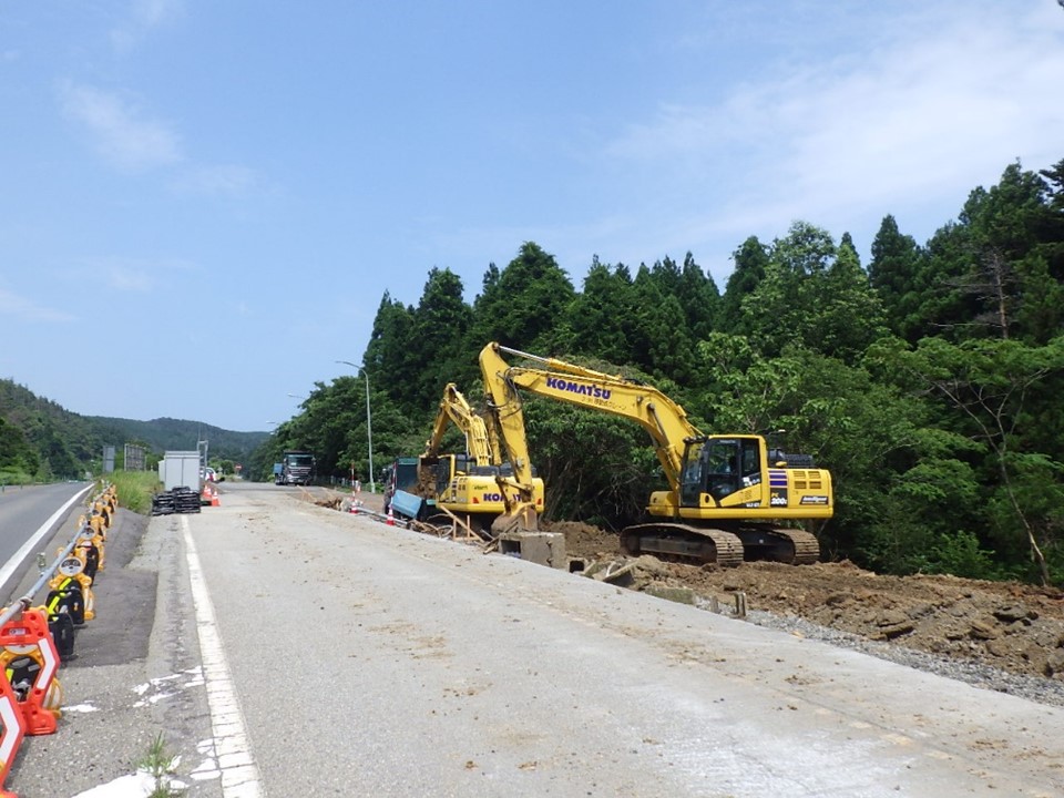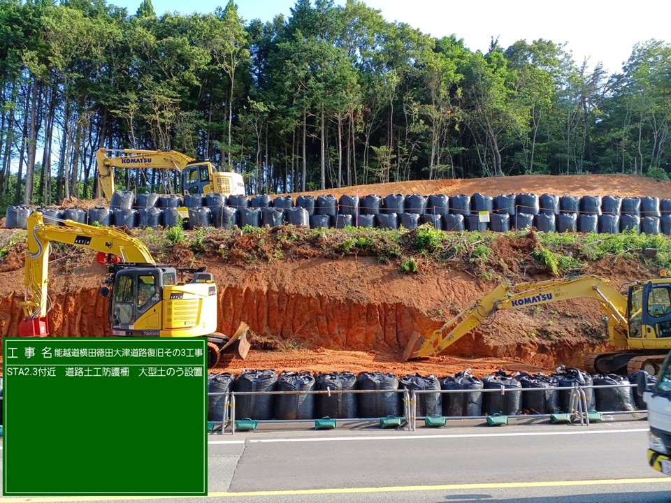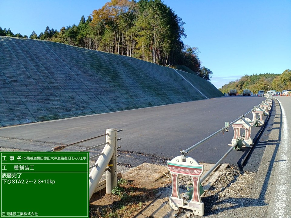 24.6~25.0kp R6 能越道穴水越の原道路復旧その2工事 施工会社:和田内潜建(株) R7.6.9 ボーリング調査 24.1~24.5kp R6 能越道穴水越の原橋梁復旧その1工事 施工会社:三井住友建設・姥浦建設JV R7.8.4 R7.7.22 R7.7.8 盛土転圧状況 改良土搬入 養生砂搬入・敷均し状況 R7.6.23 R7.6.6 ボーリング調査 伐採木集積 23.4~24.2kp R6 能越道穴水越の原道路復旧その1工事 施工会社:真柄建設(株) R7.11.4 R7.6.3 改良土受入状況 集水桝設置 20.8~21.2kp R6 能越道越の原横田道路復旧その8工事 施工会社:南建設(株) R7.7.23 R7.7.9 R7.6.25 鋼矢板継溶接 鉄筋挿入工 鋼矢板打設 R7.6.9 法枠工 23.4~24.2kp R6 能越道道路復旧その2工事 施工会社:昭和・大豊JV R7.11.5 大型土のう据付 16.1~17.0kp R6 能越道越の原横田道路復旧その6工事 施工会社:真柄建設(株) R7.11.19 R7.11.5 R7.10.16 盛土工 切り回し道路施工 仮橋施工完了 R7.10.2 R7.9.17 R7.9.4 仮橋工 盛土工 仮橋工 R7.8.20 R7.8.6 R7.7.9 仮橋工 掘削工 仮橋工 R7.6.10 掘削工 16.1~16.5kp R6 能越道越の原横田道路復旧その10工事 施工会社:川田・新井JV R7.11.11 ガードレールブロック移設 15.0~16.1kp R6 能越道越の原横田道路復旧その5工事 施工会社:南建設(株) R7.10.1 R7.9.9 R7.8.19 掘削工 小段排水工 岩掘削工 R7.8.5 R7.7.22 R7.7.4 のり面整形 掘削工・土砂運搬 小段排水工・防草コンクリート打設 R7.6.20 R7.6.9 掘削工・土砂運搬 掘削工・土砂運搬 14.3~15.0kp R6 能越道越の原横田道路復旧その4工事 施工会社:石川建設工業(株) R7.6.10 覆工板設置工 13.5~14.3kp R6 能越道越の原横田道路復旧その3工事 施工会社:大幸建設(株) R7.11.25 R7.11.20 R7.11.04 路床盛土転圧状況 鋼矢板土留工 抑止杭圧入工 R7.10.22 R7.8.5 R7.7.7 切回し道路施工 工事用道路設置 大型土のう撤去 11.3~12.5kp R6 能越道越の原横田道路復旧その2工事 施工会社:小倉・加賀田JV R7.12.9 R7.11.19 R7.11.8 区画線設置完了 舗装工 仮橋施工完了 R7.10.17 R7.6.11 地盤改良工 仮橋工 10.8~11.3kp R6 能越道越の原横田道路復旧その1工事 施工会社:(株)豊蔵組 R7.11.14 R7.10.10 R7.9.4 道路付属施設工 伐採 土砂撤去 R7.8.19 R7.6.25 R7.6.9 崩落仮設管路撤去工 法面整形 掘削工 9.8~10.8kp R6 能越道横田徳田大津道路復旧その6工事 施工会社:宮下・植木JV R7.7.9 R7.6.13 掘削工・土砂運搬 舗装版切断工 4.9~5.9kp R6 能越道横田徳田大津道路復旧その4工事 施工会社:石田・若築JV R7.11.5 R7.8.5 R7.7.8 掘削工・土砂運搬 のり面鉄筋挿入削孔 崩落部掘削状況 R7.6.25 R7.6.13 掘削工 アスファルト舗装撤去工 2.2~3.0kp R6 能越道横田徳田大津道路復旧その3工事 施工会社:石川建設工業(株) R7.11.20 R7.10.30 R7.8.29 舗装工 法面工 法面工 R7.7.11 R7.6.16 大型土のう設置 掘削工・土砂運搬 11.3~26.7kp R6 能越道横田徳田大津道路復旧その2工事 施工会社:加賀建設(株) R7.5.27 伐採・仮設防護柵設置完了 11.3~26.7kp R6 能越道横田徳田大津道路復旧その1工事 施工会社:大幸建設(株) R7.12.10 R7.11.20 R7.5.27 掘削工 掘削工、排水構造物工 仮設防護柵設置完了 11.3~26.7kp R6 能越道越の原横田舗装復旧工事 施工会社:前田道路(株) R7.7.8 R7.6.24 R7.6.11 掘削オーバーレイ工・路面掘削状況 路盤工 不陸整正 0.8~11.3kp R6 能越道横田徳田大津舗装復旧工事 施工会社:北川ヒューテック(株) R7.6.9 舗装打換え工 0.8~11.3kp R6 能越道橋梁補修工事 施工会社:(株)丸西組 R7.10.30 断面修復工 R6 能越道徳田大津高田舗装復旧工事 施工会社:(株)佐藤渡辺 R7.9.9 R7.8.25 R7.6.24 舗装工 舗装工 区画線工 R7.6.19 区画線工 R6 能越道高田舗装復旧工事 施工会社:福田道路(株) R7.7.22 R7.7.8 舗装版撤去工 舗装打換え工