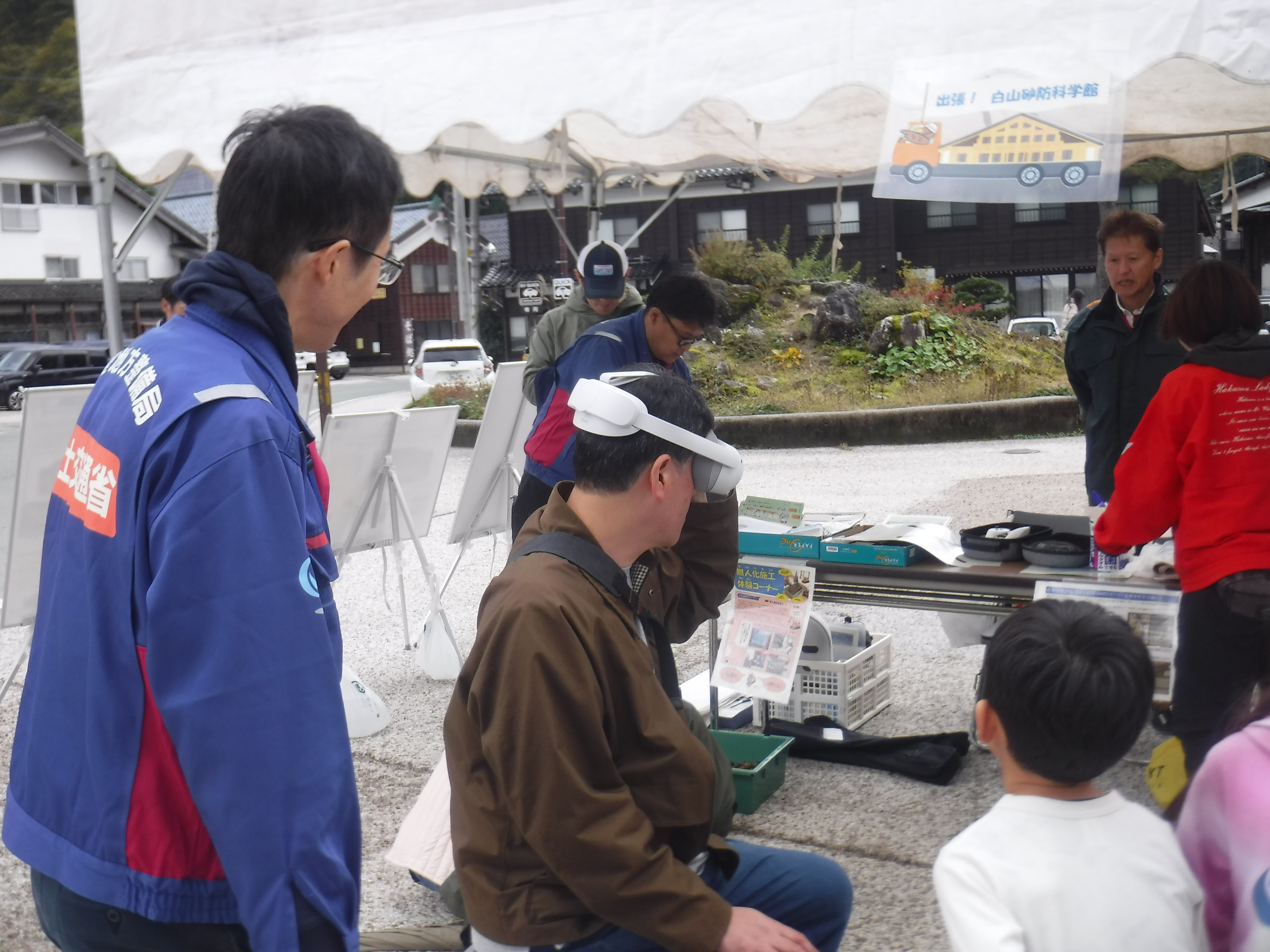 令和7年度第6回活動は、白山白峰温泉まつりにて「出張!白山砂防科学館」ブースを出展し、白山砂防科学館や白山手取川ジオパークのパンフレットの配布や、パネルの展示等を行いました。ブースでは、バックホウラジコンを用いた無人化施工体験コーナーのほか、今年度から新たにVRによる甚之助谷工事の没入体験ブースを設け、たくさんの方に体験いただきました。