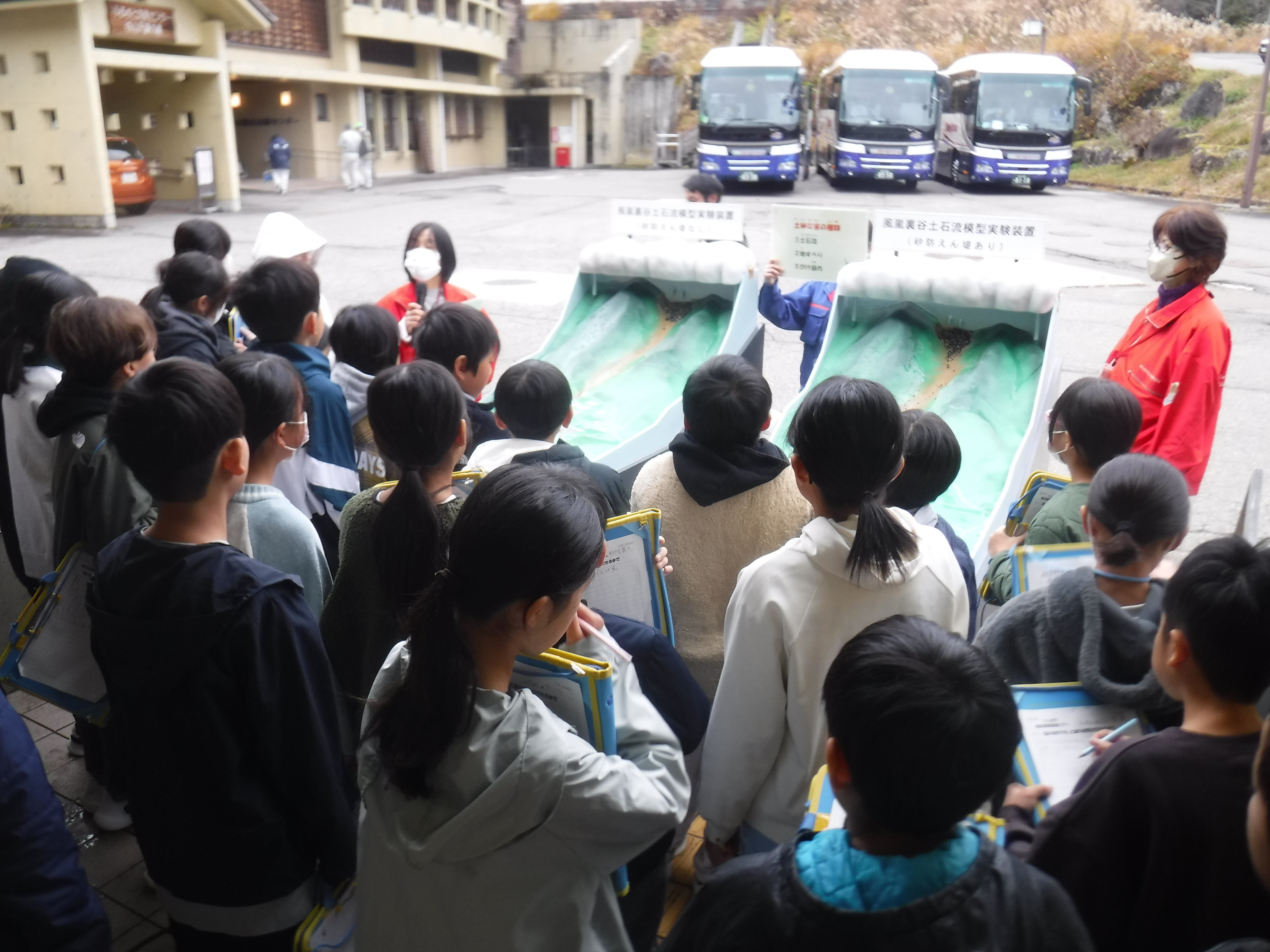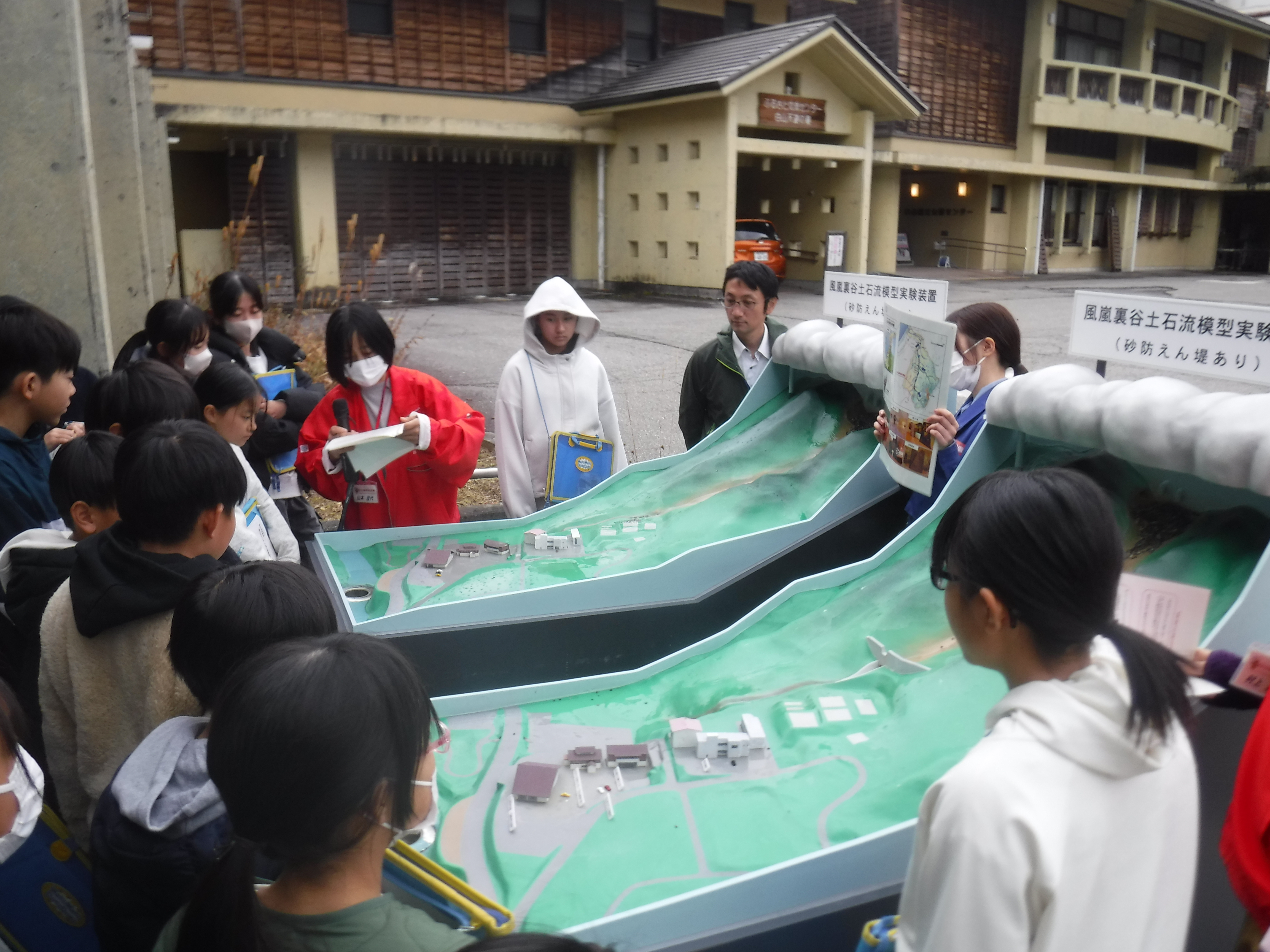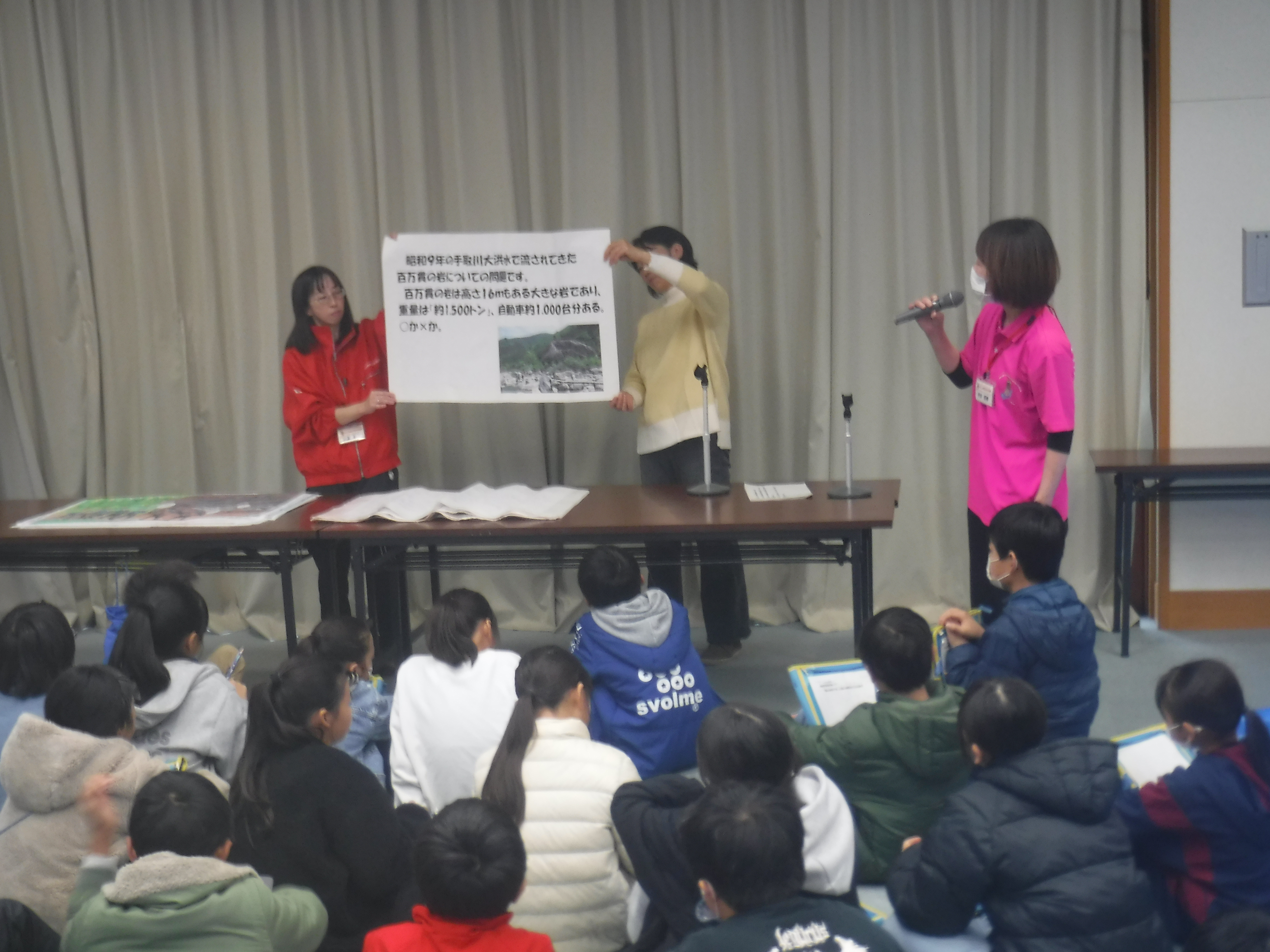 令和7年度広報活動(第3回)は、11月25日に白山砂防科学館の見学に訪れた蕪城小学校(総勢131名)の皆さんに、白山砂防特派員が広報活動を行いました。児童たちは4班に分かれ、班を入れ替えながら、白山砂防特派員から土石流模型実験の解説や白山砂防○×クイズ、紙芝居を受けました。