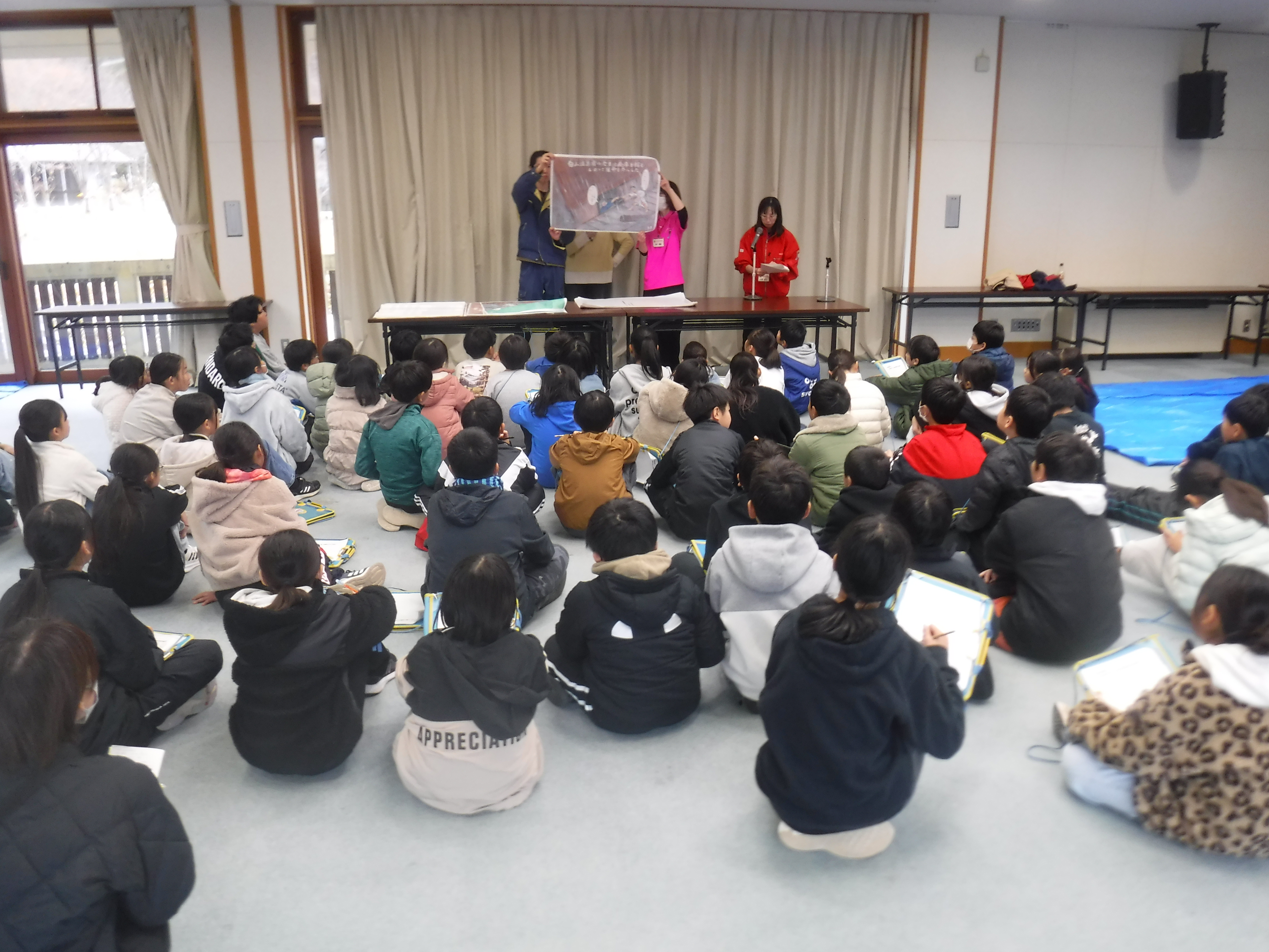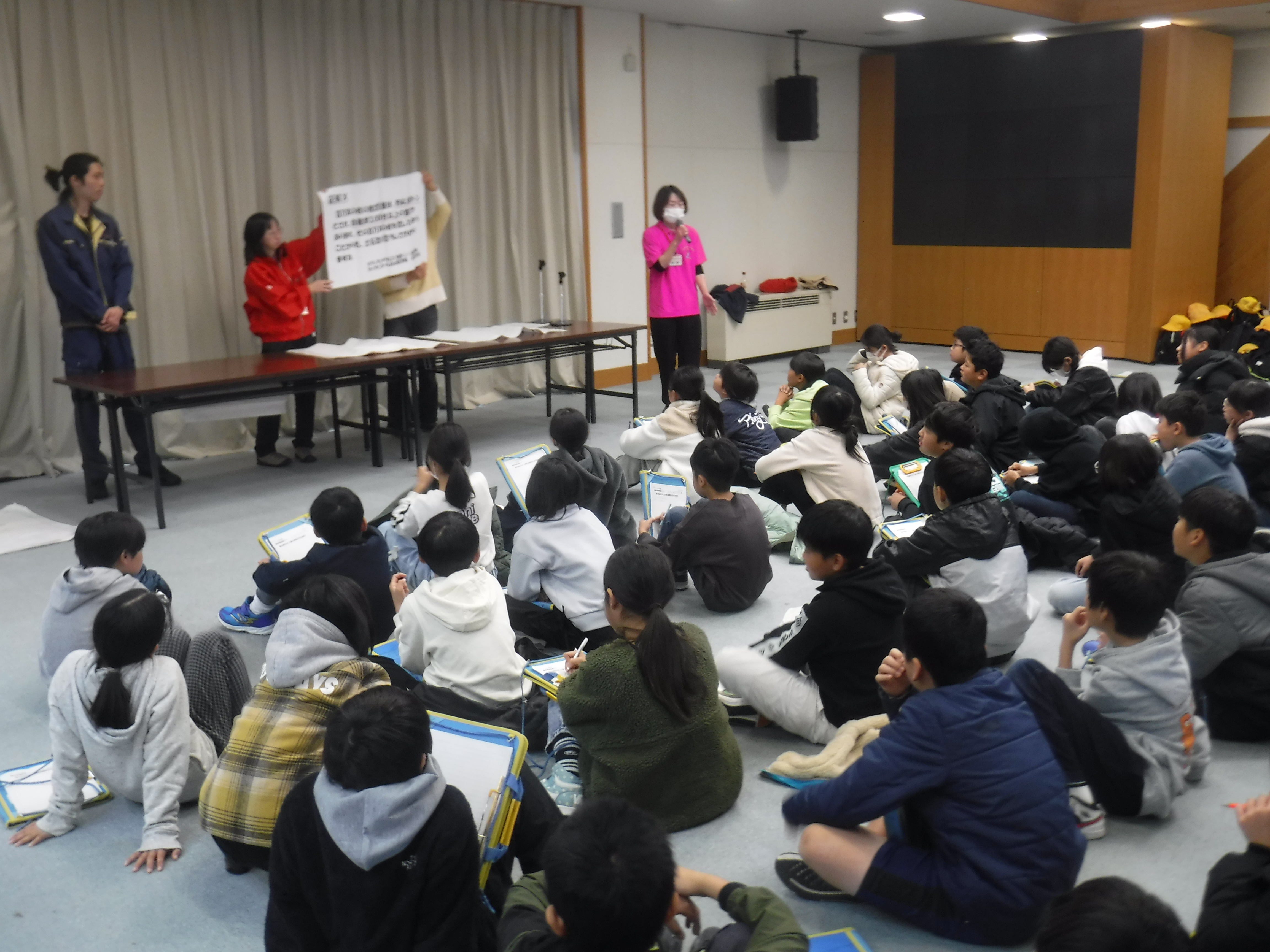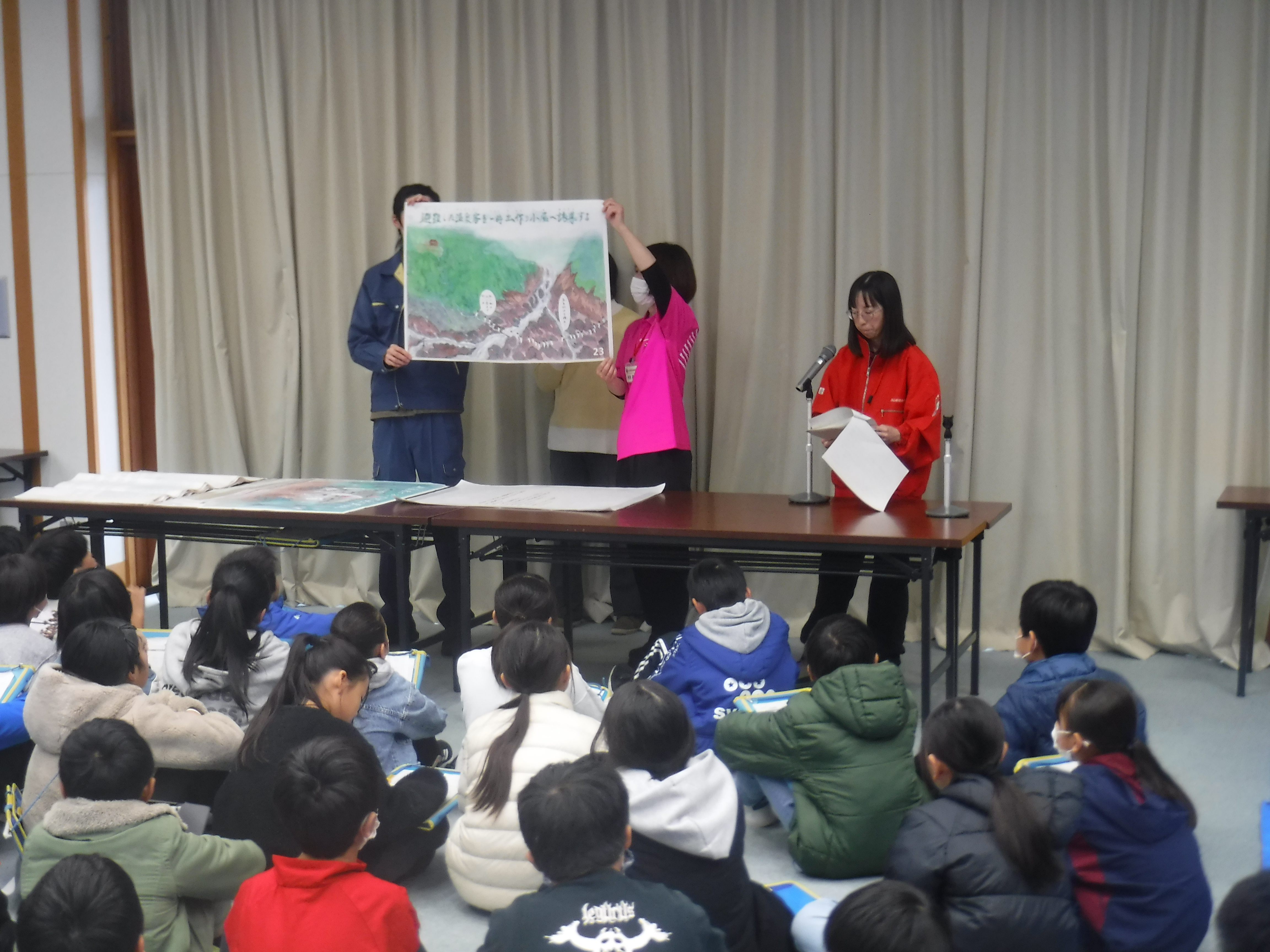令和7年度広報活動(第3回)は、11月25日に白山砂防科学館の見学に訪れた蕪城小学校(総勢131名)の皆さんに、白山砂防特派員が広報活動を行いました。児童たちは4班に分かれ、班を入れ替えながら、白山砂防特派員から土石流模型実験の解説や白山砂防○×クイズ、紙芝居を受けました。
