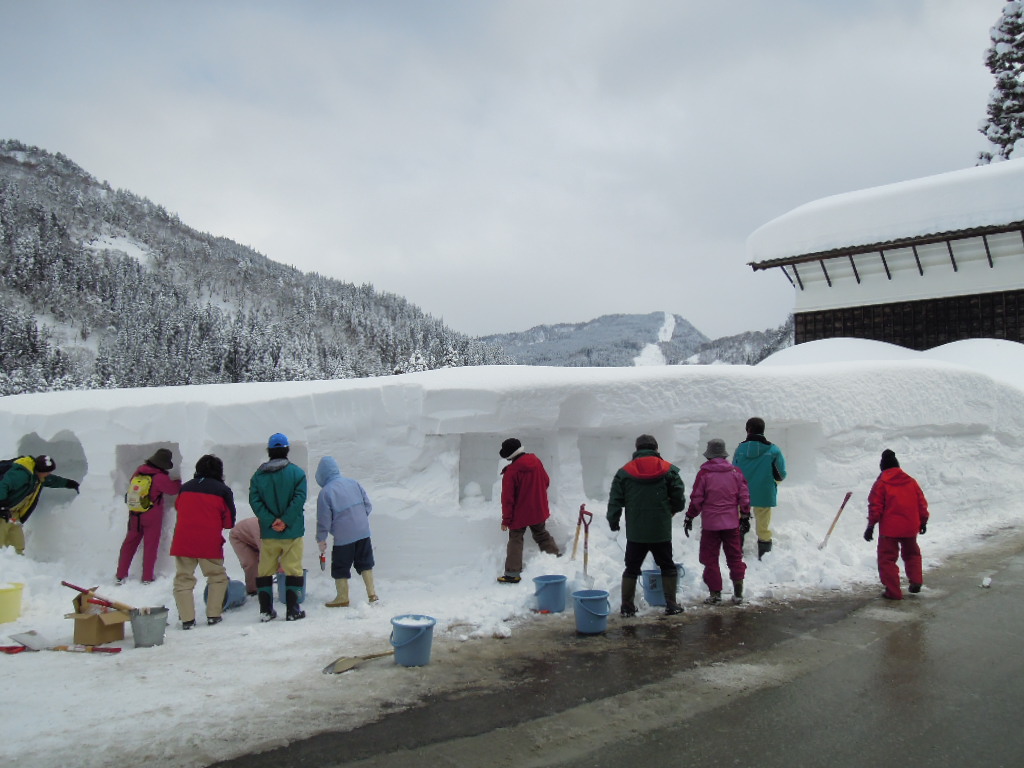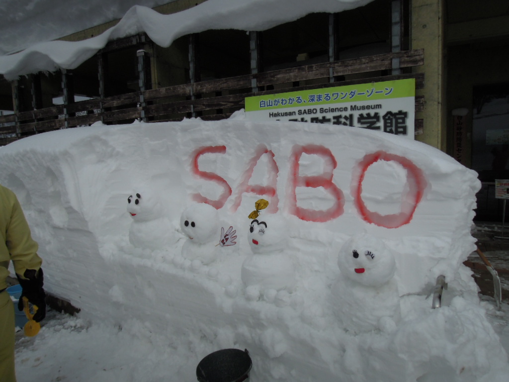 【塚崎】 【菊田】 【國田】 【三守】 【塚崎】今回は、雪だるま作りが主な活動でした。 金沢では、さわることが出来ないようなサラサラ雪でした。固まらない雪、雪玉が作れない雪、こんな雪があるんだとうれしかったです。水をくんできて固めました。 沢山の雪だるまが出来ました。食べ歩きの時間も少しあったのですが、去年より雪だるまも、お客様も、食べ物屋さんも活気がなかったように感じました。でも楽しかったです。 【菊田】第8回の活動は、2月3日の雪だるまづくりでした。 今年は、白峰の郵便局の側でつくりました。前日からの大雪で雪はたくさん降ったのですが、さらさらの雪でバケツに詰め込んでも、足で踏んでも、なかなか固まらず、困って水を入れることになりました。郵便局でお願いしたら、気持ちよく出してくださったので、バケツの水で、雪を固めながら雪ダルマをつくり、目や、鼻、口、蝶ネクタイ等、好きな飾りをして、大小20ヶ以上もの雪だるまができました。 私達は作るだけで、時間がなかったので、そのままで帰りましたが夜になって、ろうそくが灯ったら、さぞかしきれいで、かわいらしくなっただろうと、自己満足しています。 23年度の砂防特派員の仕事は、今回で終わりました。 今までいろいろ砂防の仕事を教えて頂いてありがとうございます。私のレポートでどれだけお役に立てたかわかりませんが、来年度からの砂防の仕事を引き続けてくださる方のご活躍を期待します。ありがとうございました。 【國田】今年は何度となく大雪警報が出される中、それほどでないと思いながら白峰に向かいました。ところが、そこは私の身長を遙かに上回る雪の壁が通路に続く世界でした。 厚い雪の壁を掘り、その中に鎮座するかのように雪だるまを作る。童心に帰り楽しみました。雪だるまは、ティッシュに書かれた目鼻を貼り付けると、命が吹き込まれたように可愛い表情を見せてくれました。きっと沢山の人が癒されたと思います。もう一つの驚きは何処の家でも、思考を凝らした雪だるまが作られていることでした。 すでに、お客を待つかのように完成しているもの、未だ未だ後がお楽しみと製作意欲もろもりのおじいさん、みんなで力を合わせた巨大雪だるま。静かな雪深い白峰全体がまさに、雪だるま祭りに全力投球、熱く限りなく活気づいていたと思います。 町を一回りするように裏通りを歩き進むと、カメラを構えた高齢の女性に声をかけられました。真白い幾重にも重なる雪に埋もれた風景に、赤い色がほしくて待っていたというのです。確かにそこは自然に降り積んだ雪の美しさに驚かされる景色でしたが、赤やピンクの雨具の3人はどんな風に、その景色に組み込まれたのかは知るよしもありません。 私は、そこの美しさと静けさに圧倒されながら一方でかなり後ろめたくも考えていました。そこでの暮らしを思うと、雪は大変な厄介者だと思います。生活の中に遠慮なく凄い威力で踏み込み多くを麻痺させることは想像を絶することでしょう。そこで祭りをしながらその大物と共生している人々に敬意を表さずにはいられません。春をまつには遠いように思いましたが、今頃は確実に木の芽、花卉が準備を進めていることでしょう。早く春が来るように祈らずにはいられませんでした。 来年度は、白山砂防100周年。私たち白山砂防女性特派員も、その記念すべき時に白山砂防を考え、語り、伝えることに参加できることは光栄で有り、大きい責務と思います。わたしも微力ながら活動の総括を要求されているように緊張しています。 【三守】今年の雪は、温度が低かった為か、サラサラの雪でした。ゲレンデの雪のようだとの事。私には初めての経験です。雪を丸めても固まりません。 そこで、バケツに水と雪を交互に入れ、固めて雪だるまを作りました。たくさん出来ましたが、ちょっと華やかさが足りない気がしました。 郵便局さんに水を頂き感謝します。 いままでと違った雪だるま作り楽しかったです。