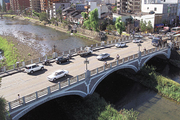 この橋は、1922年(大正11年)金沢の伝統的街並みを流れる浅野川に架けられた3径間連続アーチ橋で、橋長は54m、幅員は16.5mとあまり大きな橋ではない。しかしながら、いまもって大正ロマンを彷彿させる橋で、金沢を説明する建造物として馴染み愛されている。1989年(平成元年)には60余年目の耐久点検と、あらためての名橋の復元工事が行われた。高欄は唐草模様の格子欄干とし、側壁は金沢近郊に産する赤戸室石からイメージされる白濁したエンジ色とした。さらに白御影石で側壁を囲い、艶やかな界隈の伝統環境との調和に努めた。照明も行灯型で川面と陰影の美にも配慮されている。