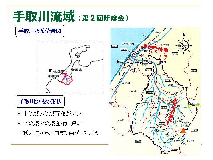 白山を源流とする手取川は牛首川、尾添川やその他支流を合流し、鶴来で流れを西に向け、山間部を離れて石川県の誇る穀倉地帯である加賀平野を潤し、美川にて日本海に注いでいます。 手取川流域の形を見てみますと上流域の面積が広く下流域の面積が狭くなっています。又、川は鶴来で大きく西に流れを変えています。もともとはもう少し北の方向に流れていたものが洪水などの影響で徐々に西の方に変わってきたようです。