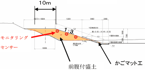 平成17年度は、手取川河口より上流約7q地点(辰口橋付近)の左岸側の能美市山田地先で延長約300mの前腹付盛土及びかごマット工を施工します。