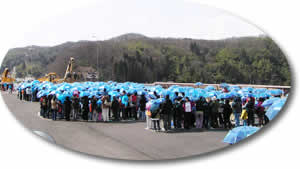 ![]() 赤い傘で「みち」、青い傘で「みらい」 という文字を作りました ![]() |