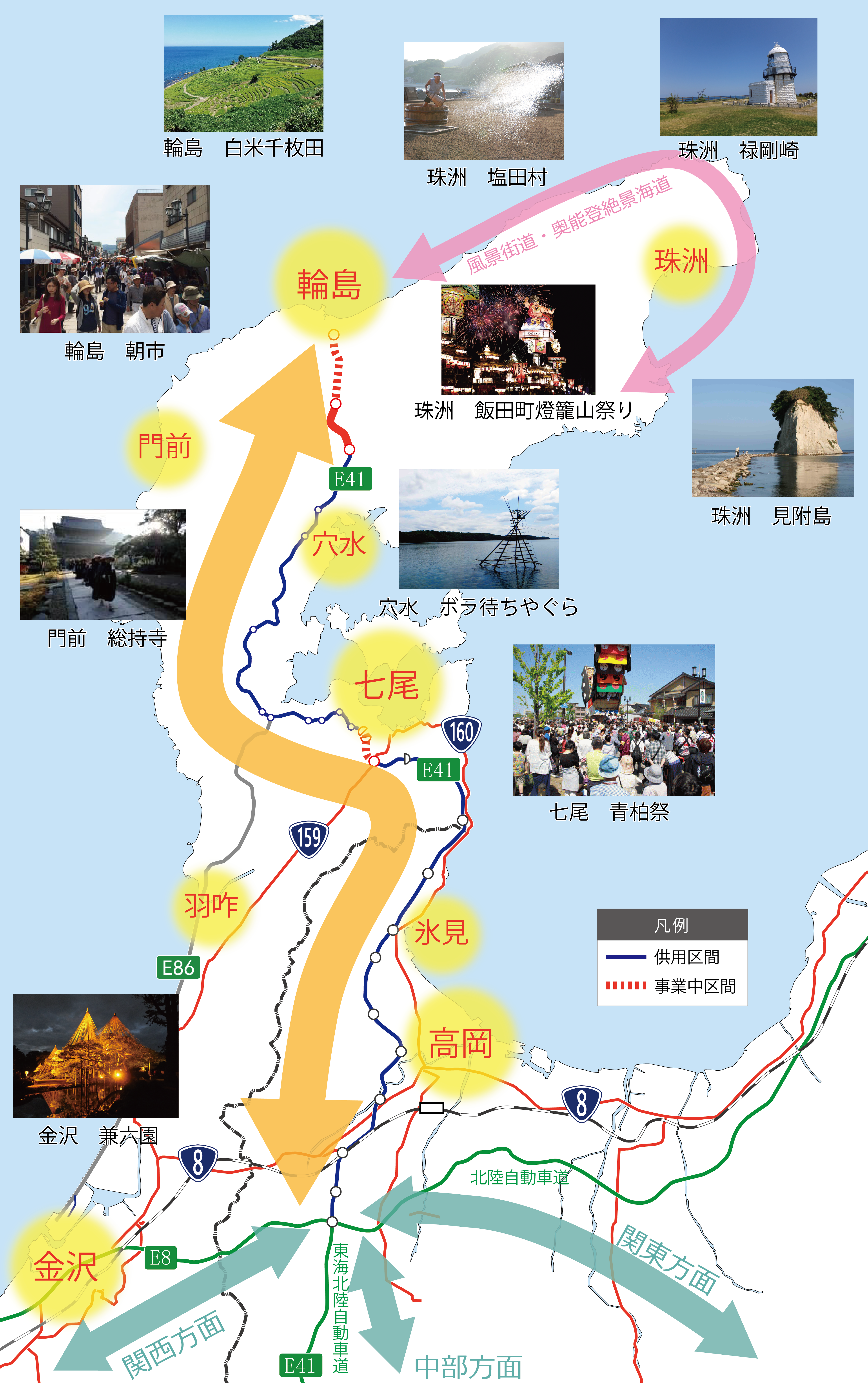 北陸自動車道及び東海北陸自動車道と接続しており、能登方面から東京・名古屋・大阪を中心とする三大都市圏へのアクセスが良くなります。