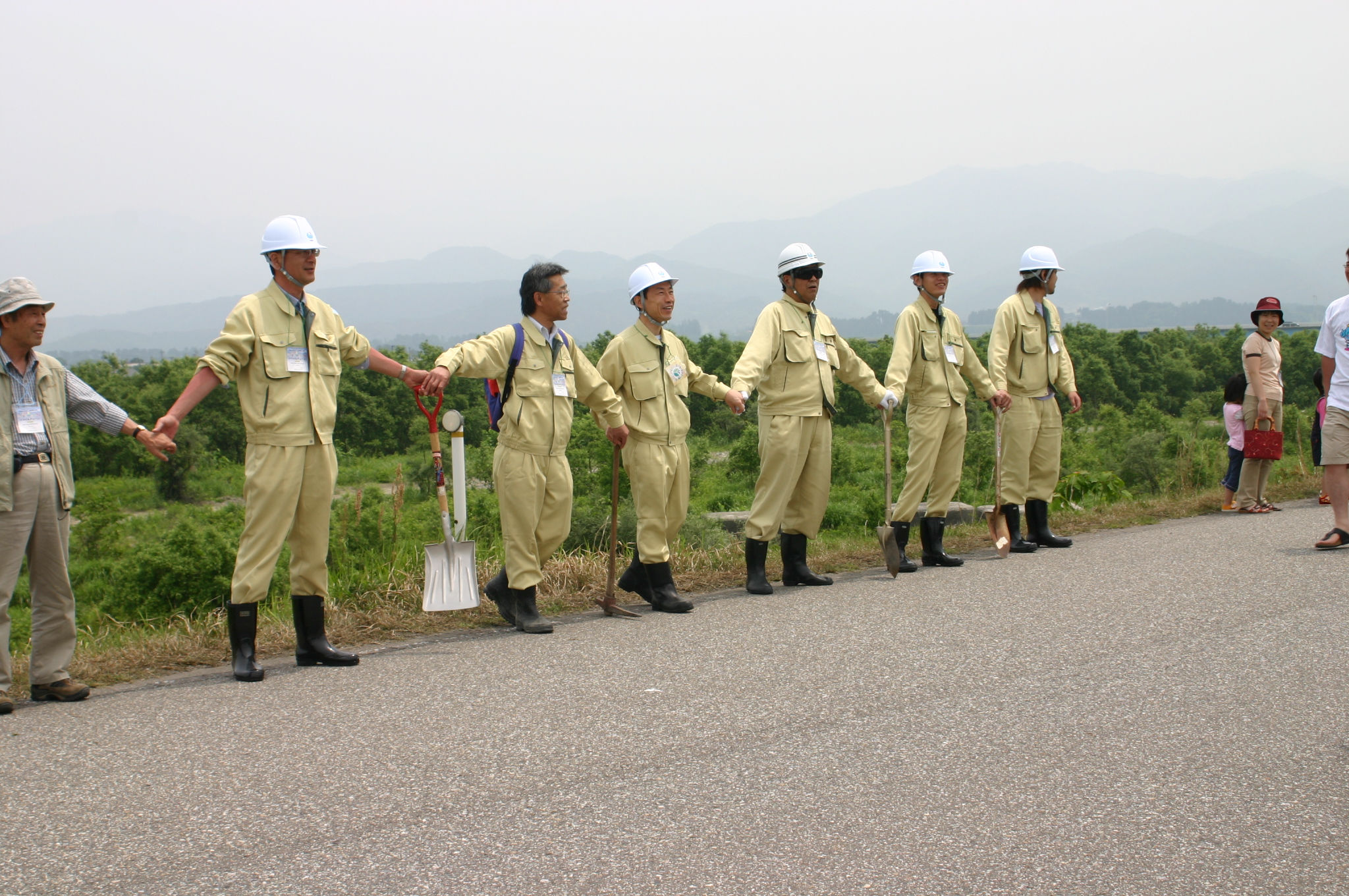 黒部川を管理する当事務所からも6人の職員が、作業服にヘルメット・長靴&スコップのコスチューム?で参加しました。地域の皆さんと一緒に、新市の誕生をお祝いさせていただきました。