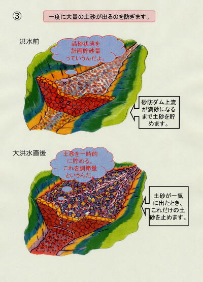 このため、砂防堰堤を構築し土砂を貯めて河床勾配を緩くし流出してくる大量な土砂をコントロールして下流に流しています。