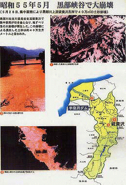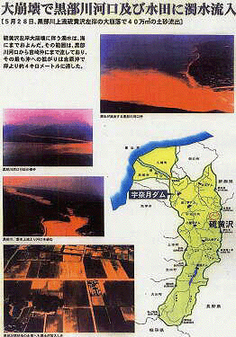 平成13年6月20日20時より出し平ダムとの連携排砂を実施していた宇奈月ダムが排砂ゲートを開けて「自然な形」で土砂を流し川の水の勢いで土砂を流す「自然流下」状態に6月21日5時になった。