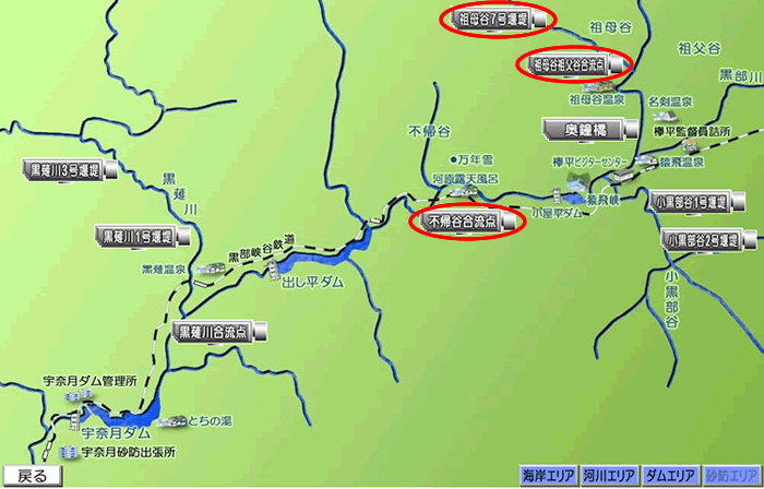 黒部河川事務所が設置しているCCTVカメラのうち、「砂防エリア」の3箇所(