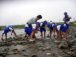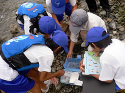 | 国土交通省では、多くの方々が河川に親しむ機会を提供し、河川愛護や水質浄化に関心を持っていただくことを目的に、昭和59年度から水生生物の生息状況の観察による水質の簡易調査を実施しています。黒部川では夏休み期間中に、黒部市内の小学5、6年生から構成される「くろべ水の少年団」(事務局:黒部市吉田科学館)により調査を実施します。 |