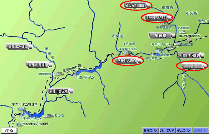 不帰谷合流点,祖母谷祖父谷合流点,祖母谷第7号堰堤、小黒部谷第2号堰堤