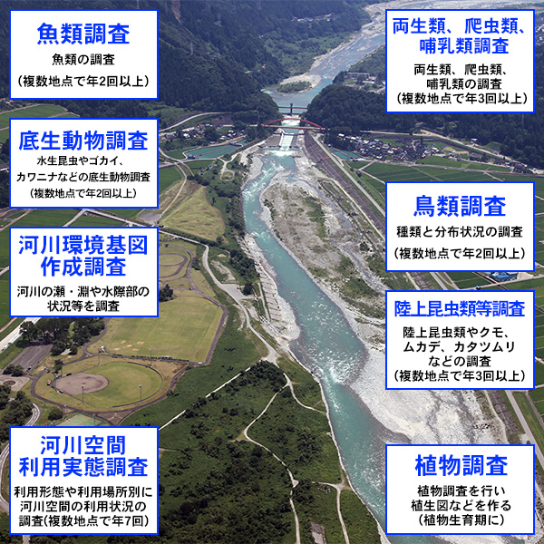 魚類、底生動物、植物、鳥類、両生類・爬虫類・哺乳類、陸上昆虫類等、動植物プランクトン(ダム湖版のみ)