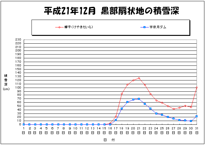 平成21年12月の積雪深量 単位:cm(センチメートル)