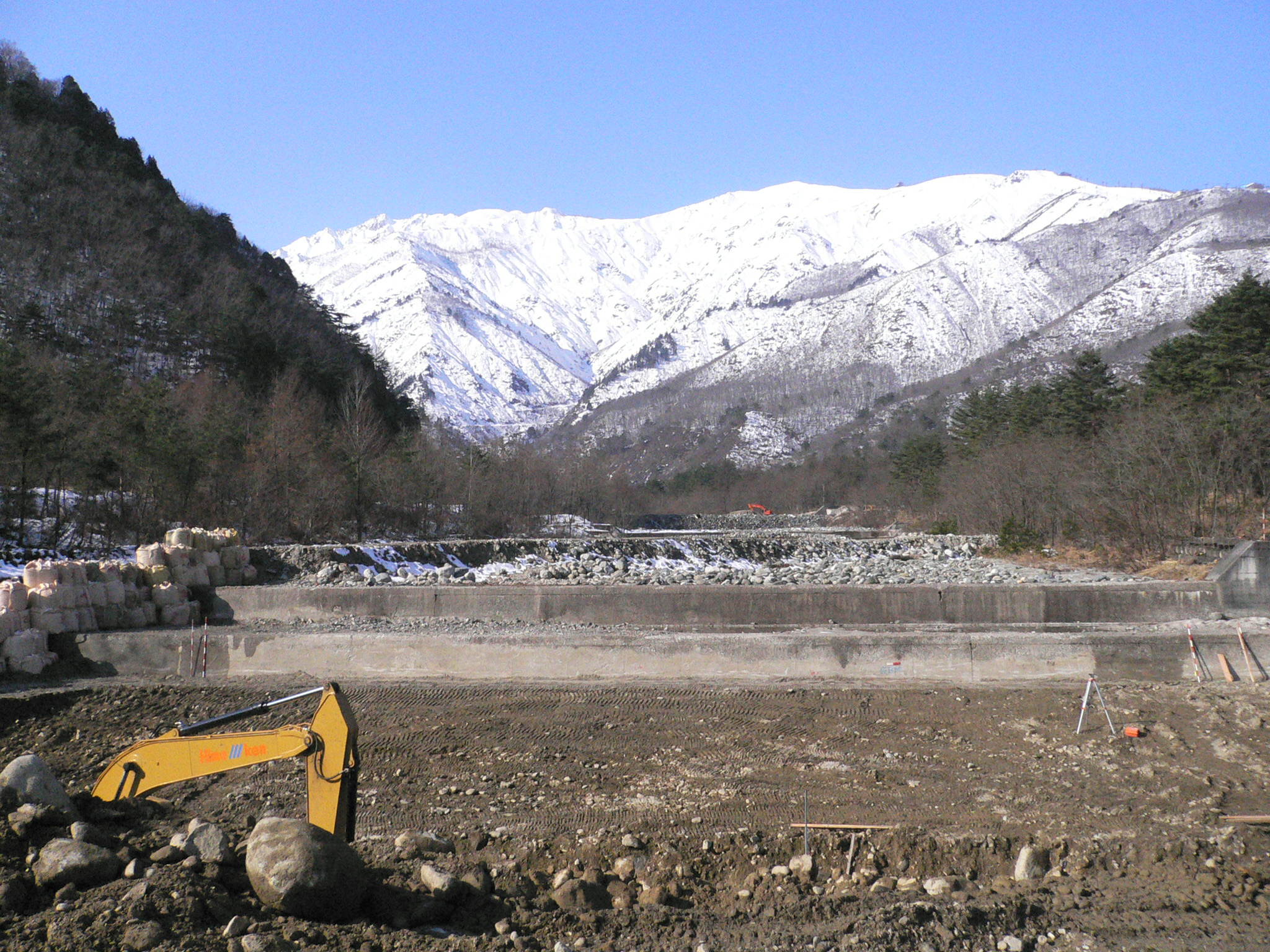 後方に見える唐松岳などは、白く雪化粧をしましたが里にはまだ雪がほとんどありません。現場で工事をする上ではありがたいのですが一方でスキー場などは、本格的な降雪を待ちわびていることと思います。