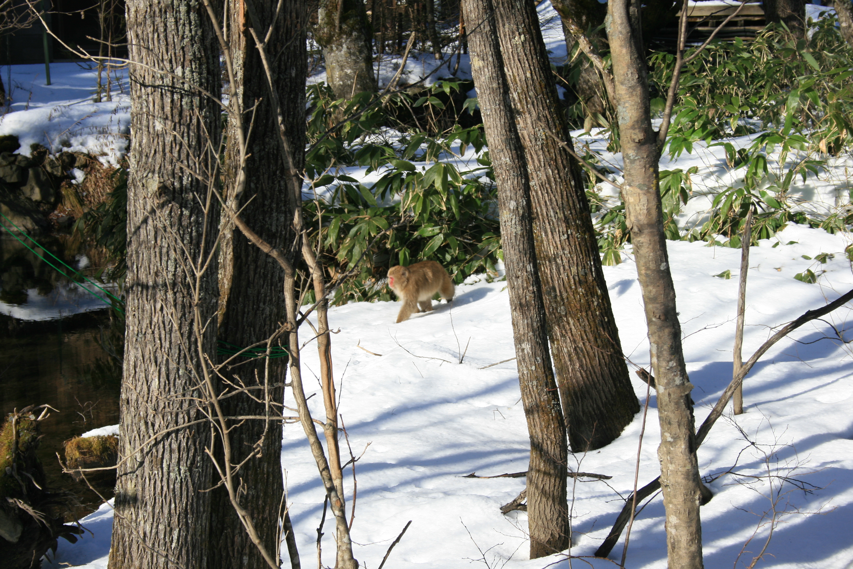 梓川本川帯工工事の現場付近に現れたニホンザルです。他の仲間は、木の上にいましたが、このサルは川の中でえさを探しているようでした。上高地は冬本番になると、重機が移動してもキャタピラの跡がつかないくらい地面が凍ります。そんな厳しい環境の中で工事が進められます。