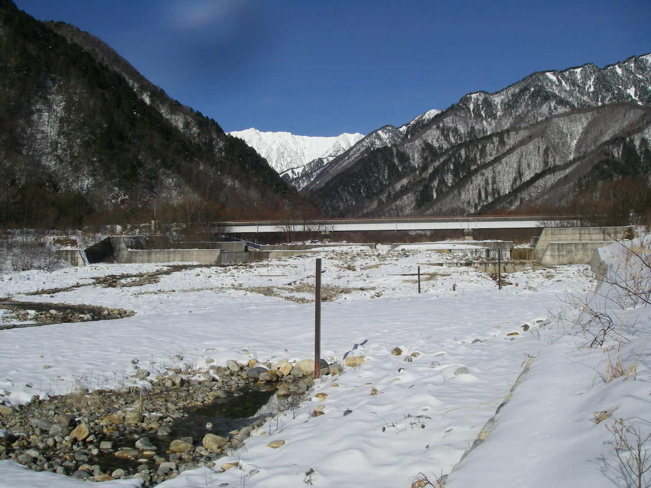 写真は、篭川1号床固工です。見えている橋は篭川大橋です。篭川の左岸には県道扇沢-大町線が走っており、立山・アルペンルートの入口となっています。