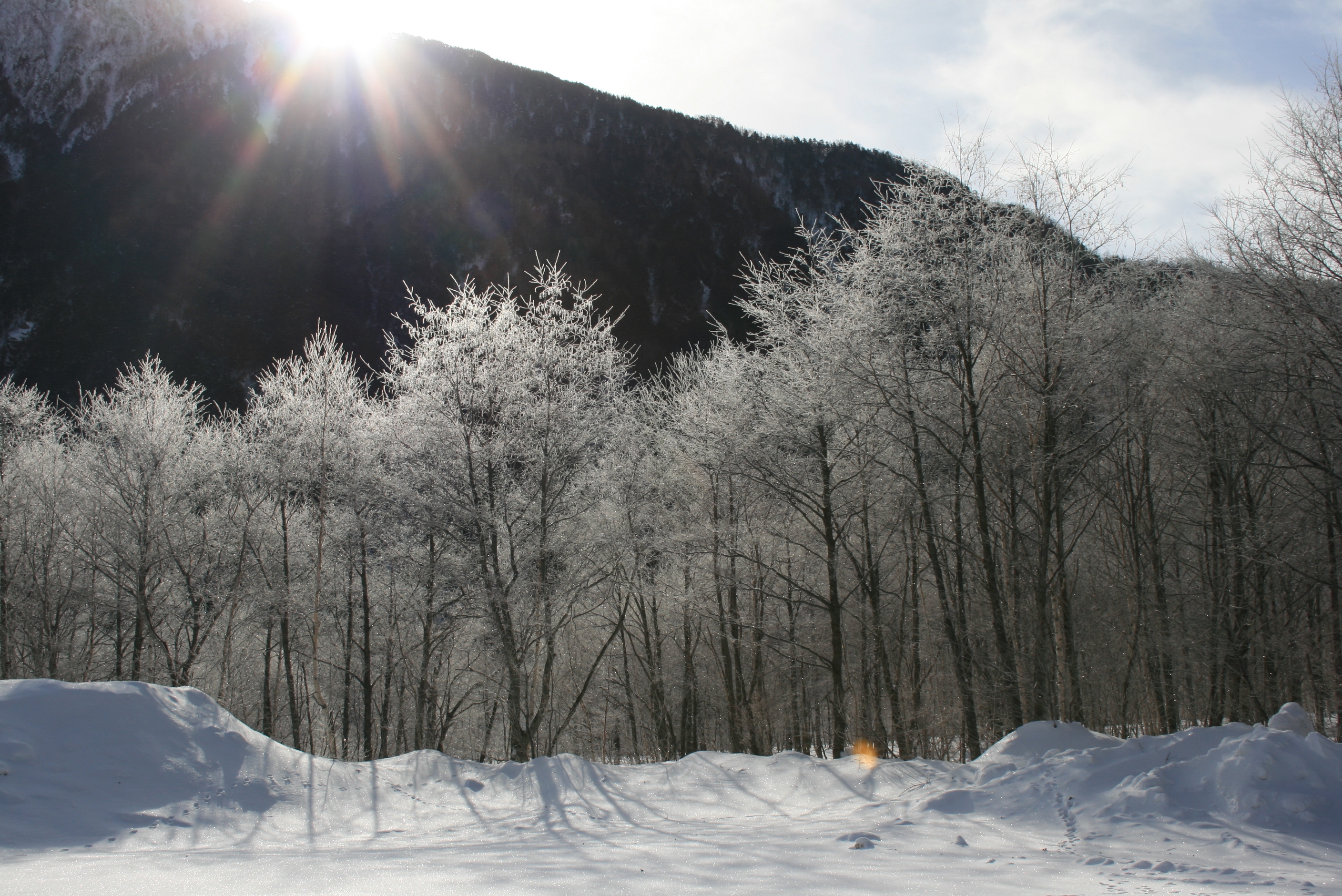上高地の朝の景色です。今年は例年になく暖かいですが、それでも工事車両が走った跡が付かないくらい地面が固く凍ってしまう厳しい環境の中で工事が進められています。この時期に工事を行うのは、上高地の観光に配慮してのことです。