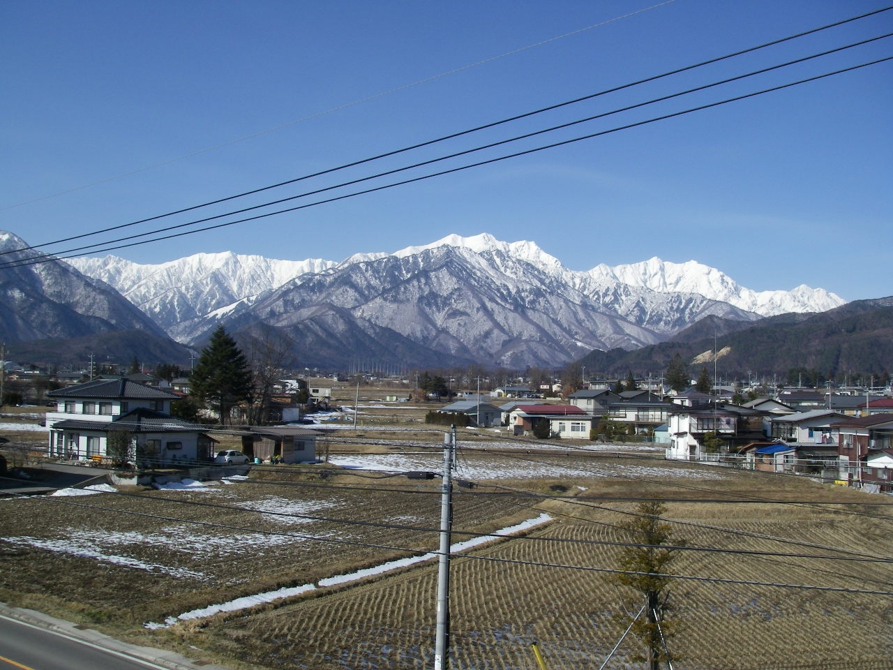 鹿島槍・爺ヶ岳・岩小屋沢岳等の美しい峰々です。3月になりましたが、2月の大町市は例年になく穏やかな日が多くこのように美しい光景がよく見かけられました。