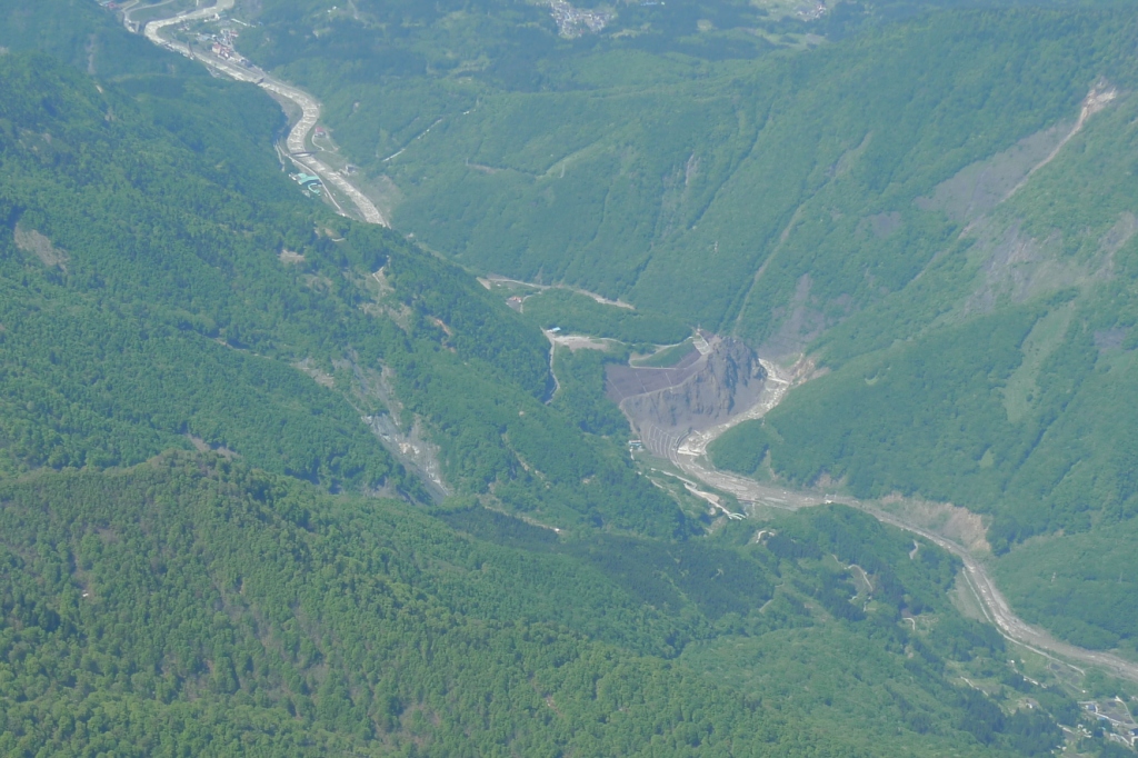 中央付近の黒い山塊が葛葉山腹工の施工現場です。平成7年の豪雨による姫川本川の増水により山腹斜面が渓岸浸食を受け、約12万m3もの土砂が流出し下流部に甚大な被害を及ぼしました。
