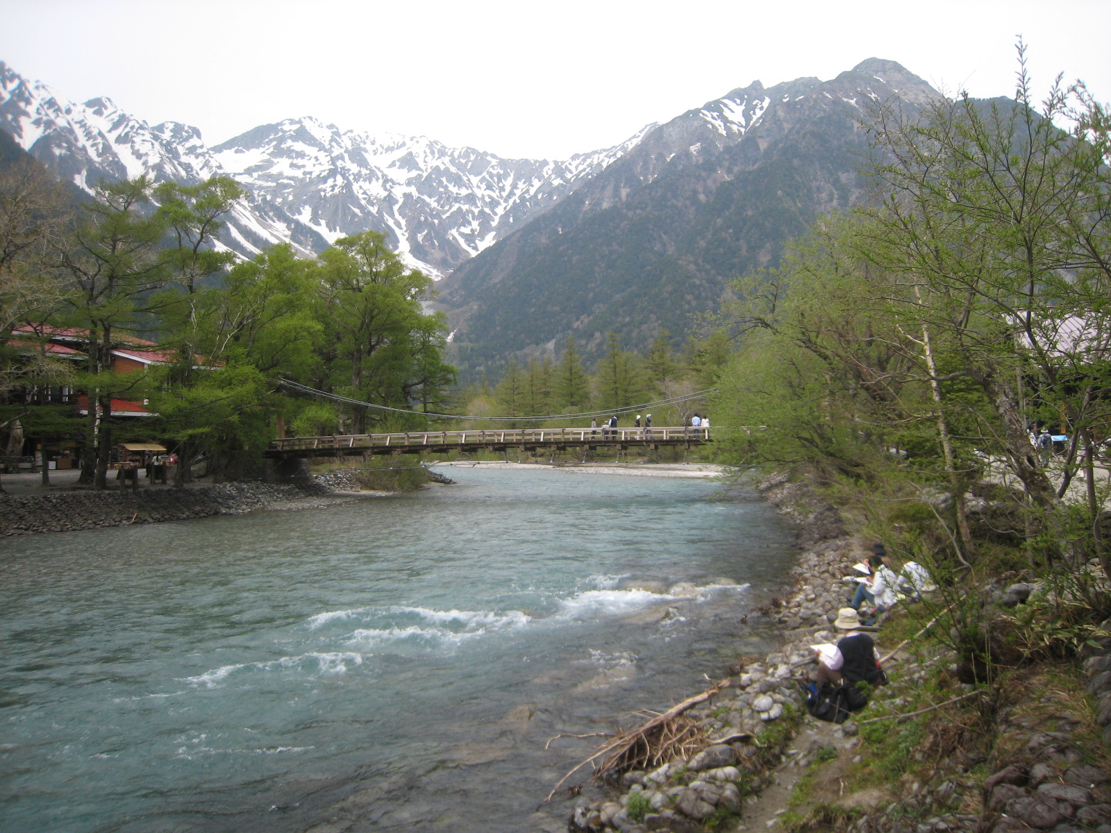 今の時期は新緑が鮮やかな季節で、穂高連峰を望む梓川周辺では散策をしたり、スケッチブックに向かう人、河童橋では周囲の山をバックに写真を撮るなど多くの人が上高地の自然を満喫しに訪れています。 |