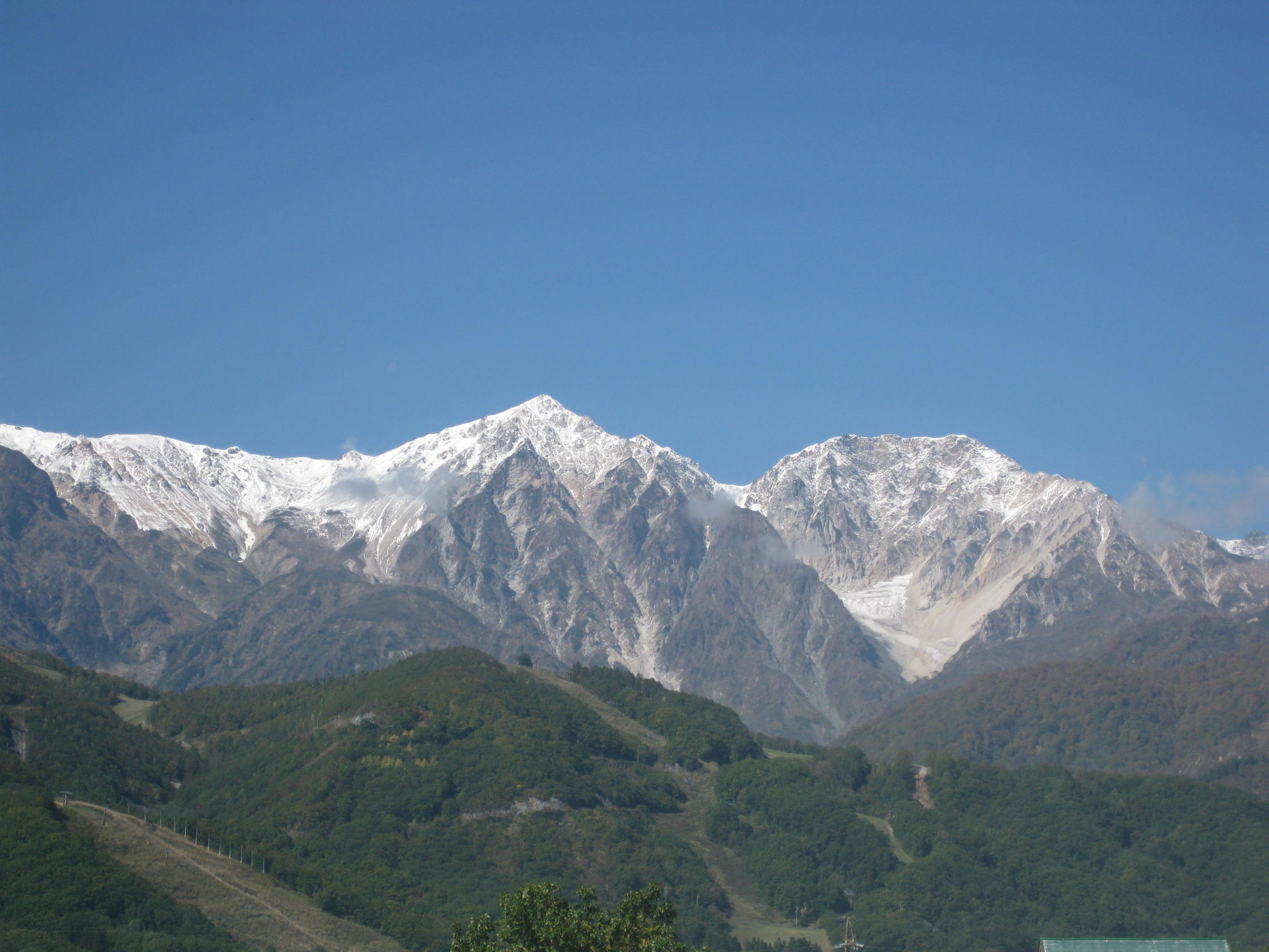 写真中央の尖った山が白馬鑓岳、右隣が杓子岳です。