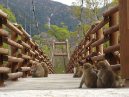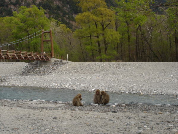 上高地の梓川に架かる明神橋でサルの群れに会いました。観光客が脇を通っても逃げもせず、毛づくろいをしたり、じゃれあったりしています。厳寒の中、木の皮を剥いで腹の足しとし、何とか冬を乗り切ったサル達のくつろぐ姿を見ていると、なんだか愛しく思えてきます。