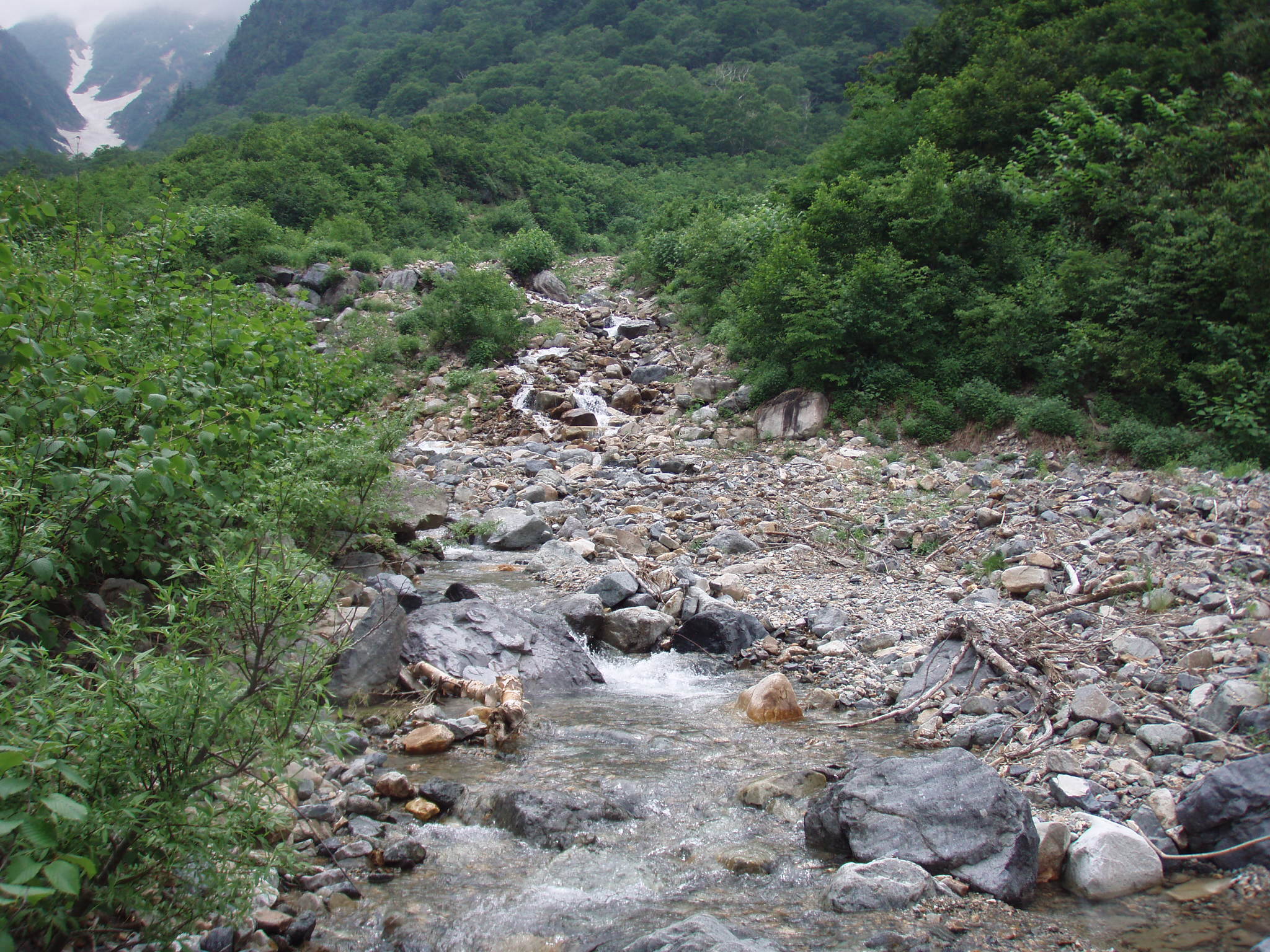 水と緑の篭川・大町市 扇沢駅を越えて、登山道を歩くと、途中崖崩れの痕跡あり。 寒いなーと思ったら残雪がまだありました。 出水時にえさが取れずやせ細ったイワナたちが、今一生懸命えさを食べている時期です。 登山道はオオイタドリが繁茂、黄色くなってちょっと幻想的。関東でも見られますが人の背丈まであるのは日本海型。 川幅が狭まり流れが早くなっている所、白く波立っているところはマイナスイオンの宝庫。 その早瀬沿いの木立の中に入ると、この時期でも、急にひんやりして気持ちがいい。登山客も巨石の上でひと休み。