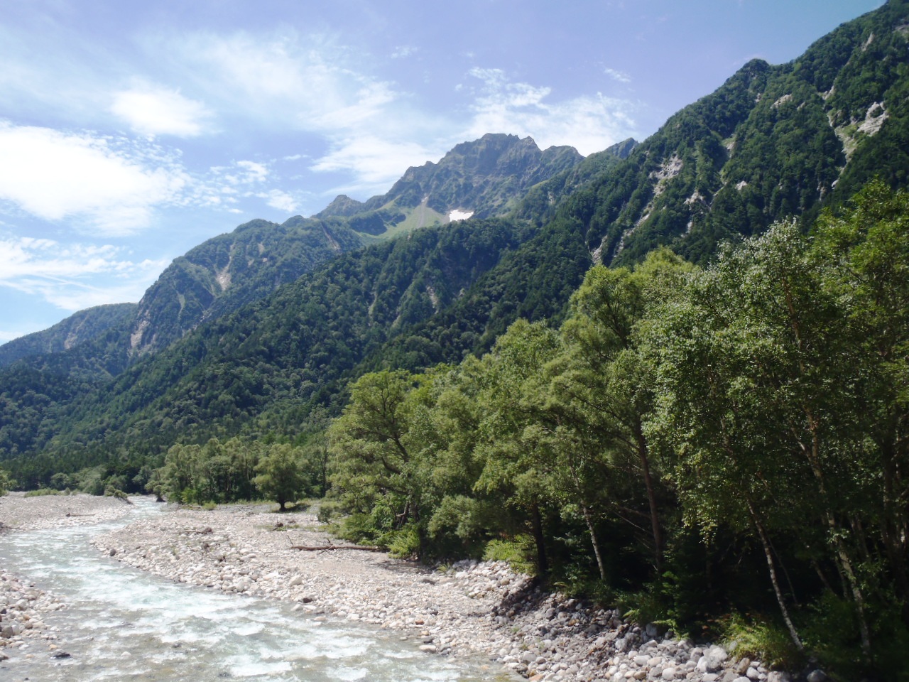 奥上高地は不快指数ゼロ 上高地の横尾大橋から見た梓川と前穂高岳・明神岳です。 前線の停滞で連日うっとうしい天気が続いていますが、この日はカラっと晴れて体感での“不快指数はゼロ”。 これから台風の季節になりますが、穏やかであってほしいと思います。