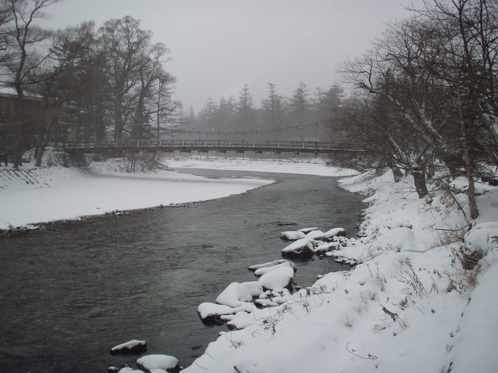 −雪の河童橋− 11月14日の閉山間際の上高地河童橋です。 上高地は降雪があり、一面の雪景色です。 ついこの間まで赤や黄色に彩られていたのが、あっという間にモノトーンに変わってしまいました。 観光客はほとんどいませんでした。