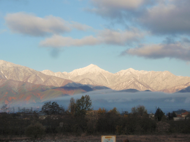 雪をかぶった山々が朝日を受けて白く輝いているように見えます。