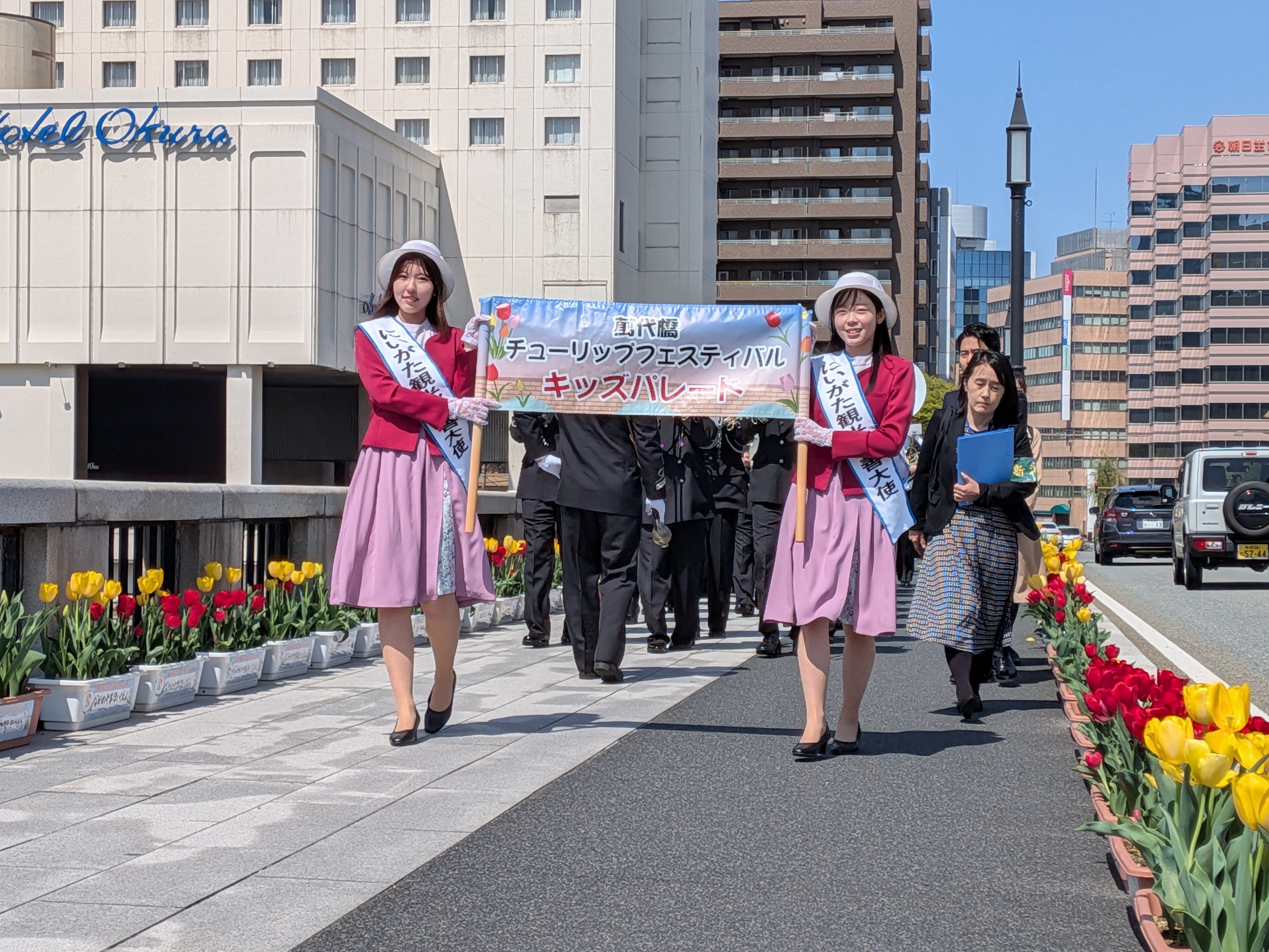 4月14日(火)、新潟市主催により昭和61年に初代萬代橋架橋100周年を記念して始められ、今年で41年目を迎える「萬代橋チューリップフェスティバル2026」のオープニングセレモニーが行われました。