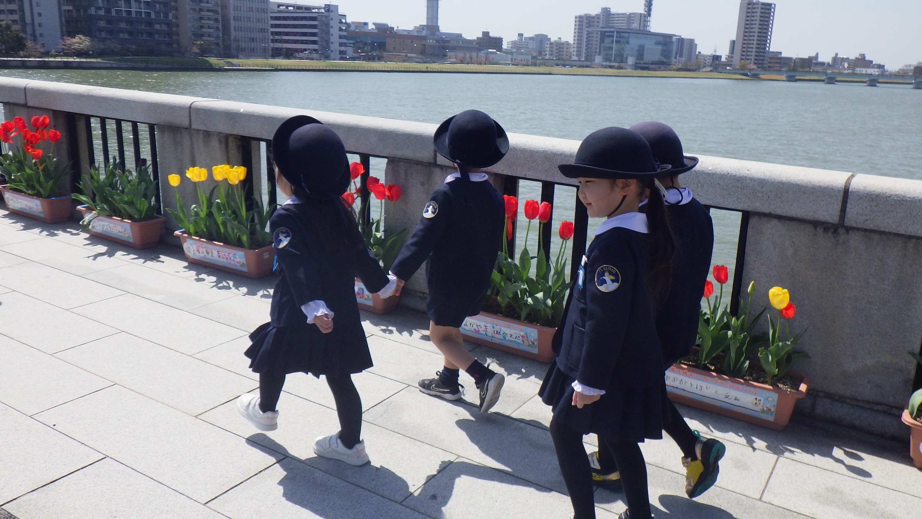 セレモニーには園児23名が参加し、新潟市消防音楽隊の演奏でチューリップを合唱、元気な歌声を披露していました。西詰でのセレモニー終了後、新潟市消防音楽隊の演奏にあわせてパレードがおこなわれました。園児たちは音楽に合わせ、咲いたチューリップを探しながら楽しそうに長い萬代橋を渡りきりました。