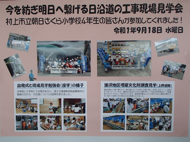 現場見学報告会では、日沿道の工事現場に近接している、村上市立朝日さくら小学校4年生から、見学して学んだことや感じたことの報告がありました。