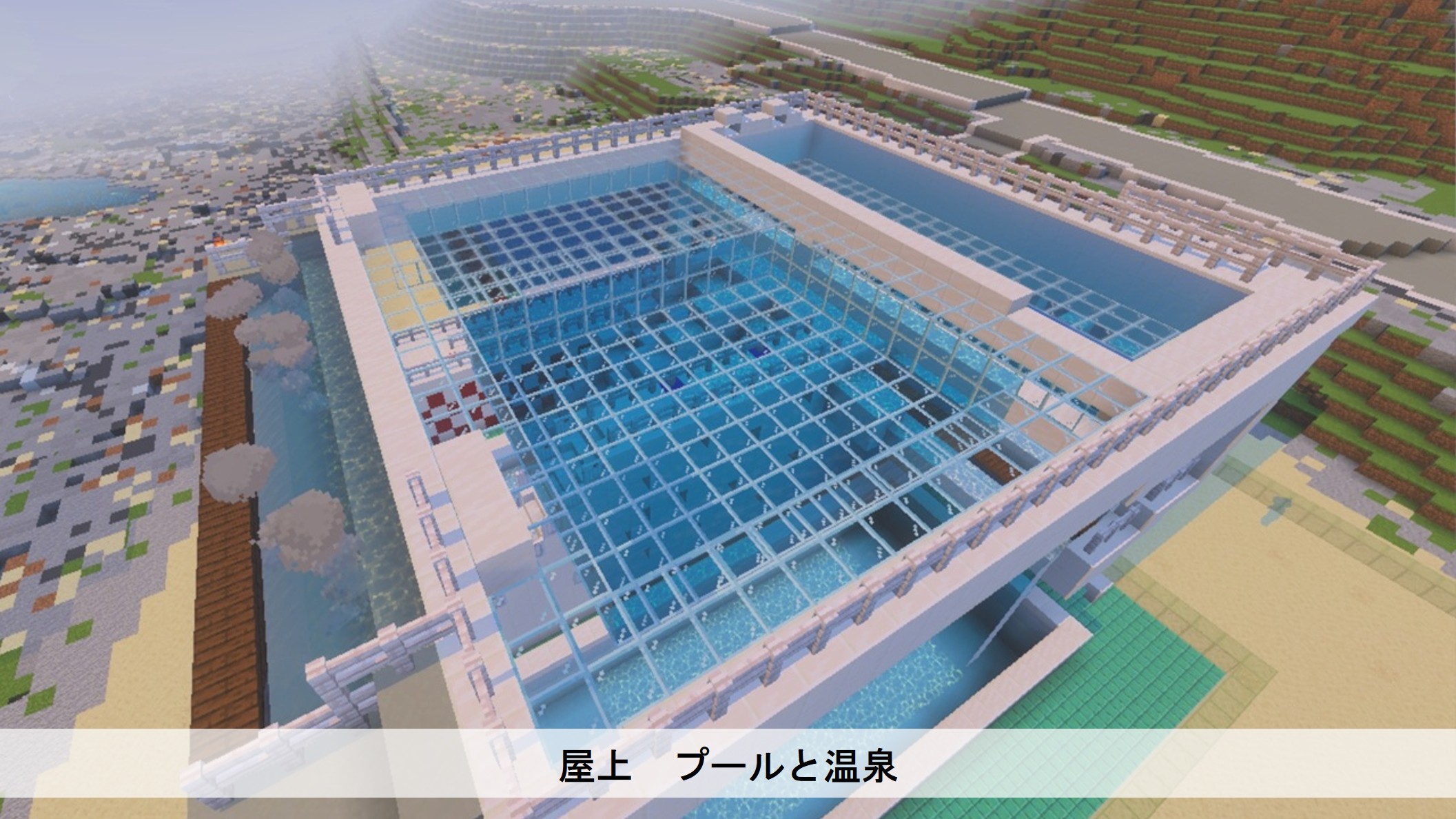 景色を楽しめる大きなプールをつくりました。屋上には温泉もついていて、温泉につかりながら絶景を楽しむことができます。プールの横には貯蓄倉庫と、たくさんの個室スペース作りました。普段は様々なことに利用でき、災害時にはプライベート空間として利用できます。