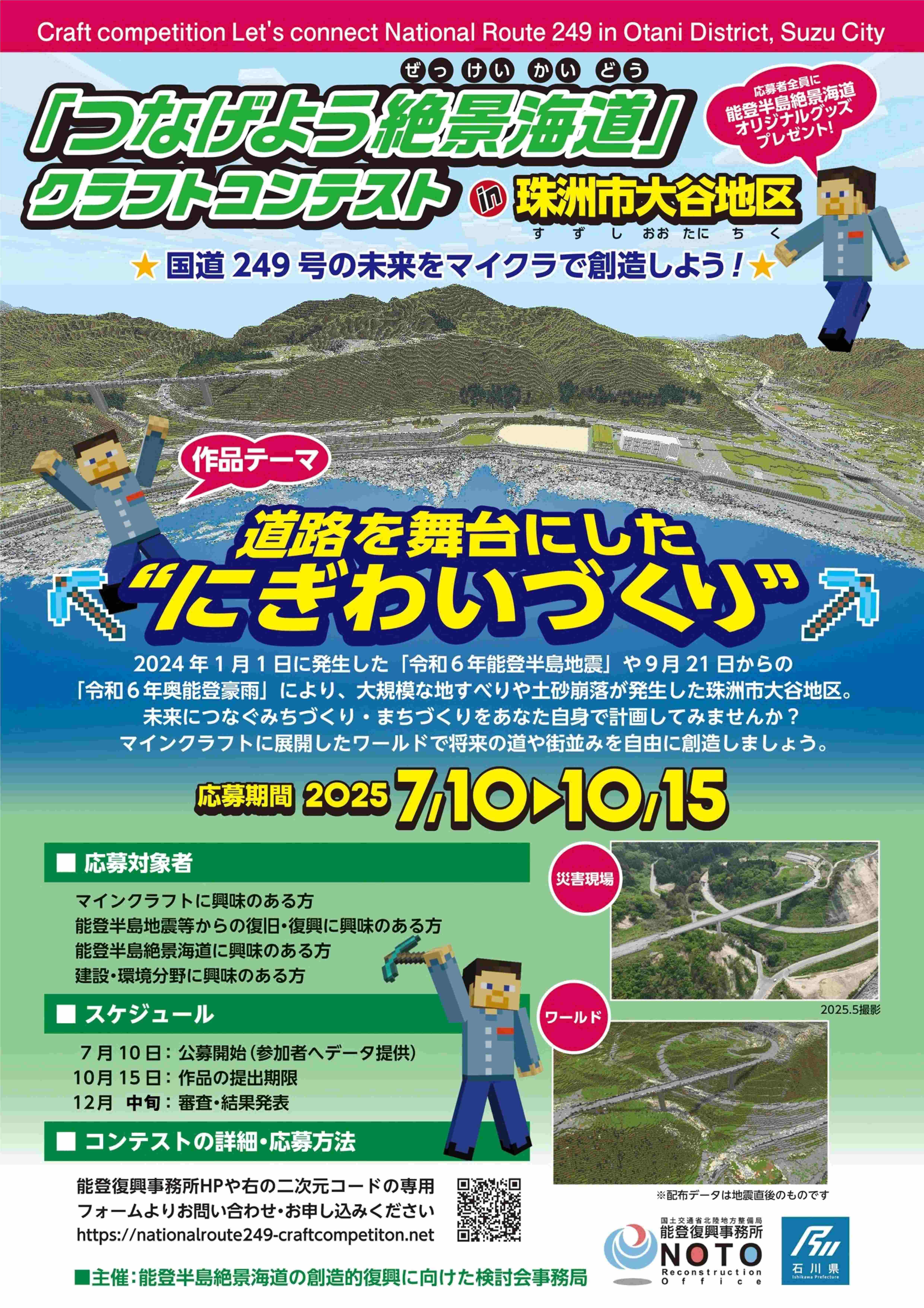 2024年1月1日に発生した「令和6年能登半島地震」や9月21日からの「令和6年奥能登豪雨」により、大規模な地すべりや土砂崩落が発生した珠洲市大谷地区。能登復興事務所では、珠洲市大谷地区周辺の地形を「マインクラフト」のワールドデータ上で再現し、『道路を舞台にした"にぎわいづくり"』をテーマとして、これから復旧する将来の道や街並みのデザインを広く募集しました。
