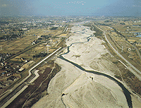 上の図面は、河口から8キロメートル地点の常願寺川の断面図です。昭和22年当時には、上流からの多量な供給土砂により河床が上昇し、洪水の危険に見舞われていましたが、河床を掘削し、洪水を安全に流す努力を進めてきました。今後は、上流からの土砂量を適切に調整することが必要となります。