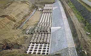 近年の河床低下により、既存の護岸が河床より浮き上がり、危険な状態になっているため、根継ぎ護岸を施工しています。