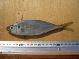 体長40cm。体は細長く側扁する。背方は暗青褐色から黄褐色。腹方は銀白色。
