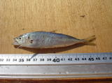 体長30cm。尾鰭は淡黄色〜淡紅色。小離鰭がある。頭頂鱗は眼の中央を越える。
