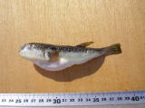 体背方は暗緑色で多数の白色点が散在する。胸鰭後方の体側に大きな黒色斑がある