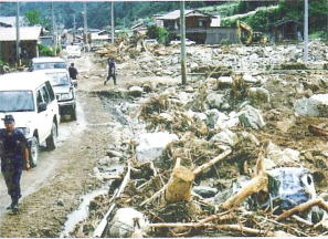 | 山腹、川底の石や土砂が集中豪雨などによって一気に下流へと押し流されるものをいいます。その流れの速さは規模によって異なりますが、時速20〜40qという速度で一瞬のうちに人家や畑などを壊滅させてしまいます。 | ||||||||||||||||||||||